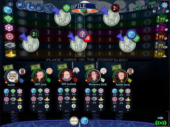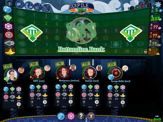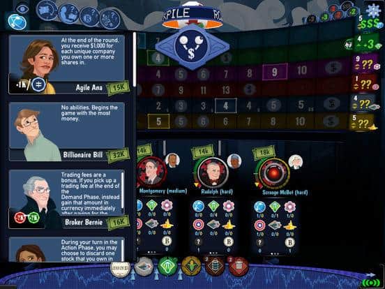 Juego Stockpile – juego de mesa económico para IOS donde compras o vendes acciones en el mercado de valores. Juegas el papel de un inversionista de finales del siglo XX y formas una fila para frustrar un increíble premio acumulado vendiendo acciones. Compra y vende acciones, así como compite con tus competidores y trata de ganar tanto dinero como sea posible. Cada jugador no sabe todo sobre el mercado de valores, pero tiene alguna información valiosa. Al comprar o vender acciones, considera los diversos factores del colapso o quiebra de las empresas. Tómate un riesgo e invierte todo el dinero en las acciones de una sola empresa o minimiza tu riesgo distribuyendo tu capital para comprar acciones de diferentes empresas.