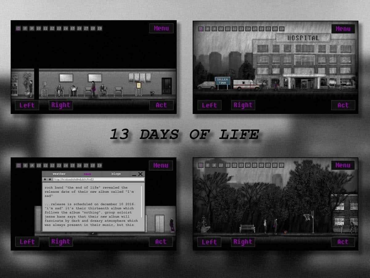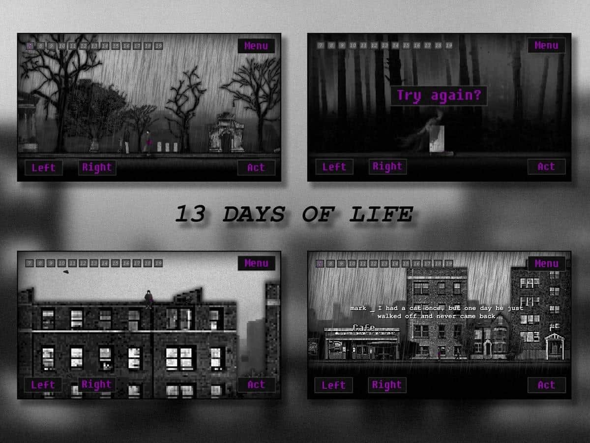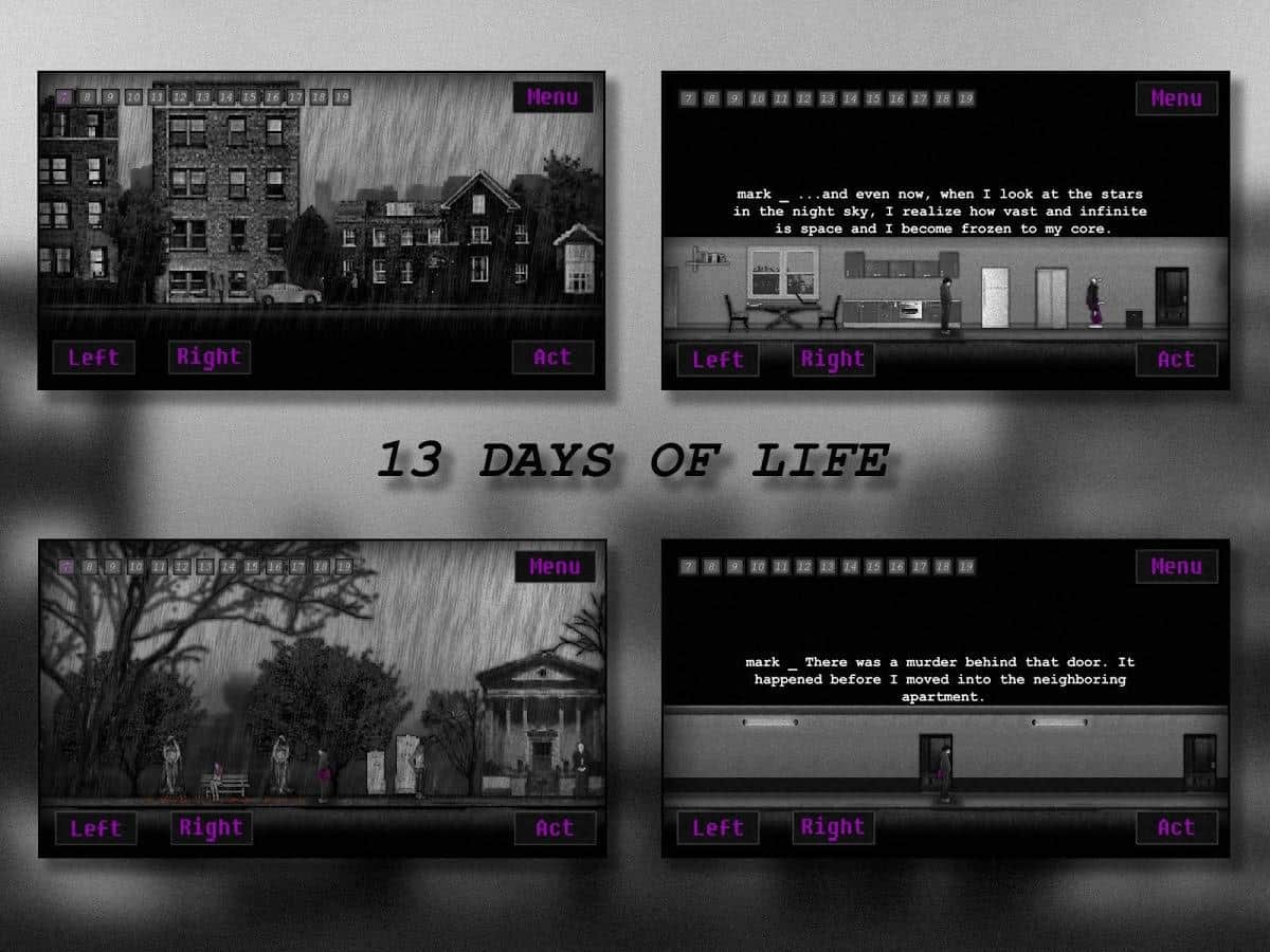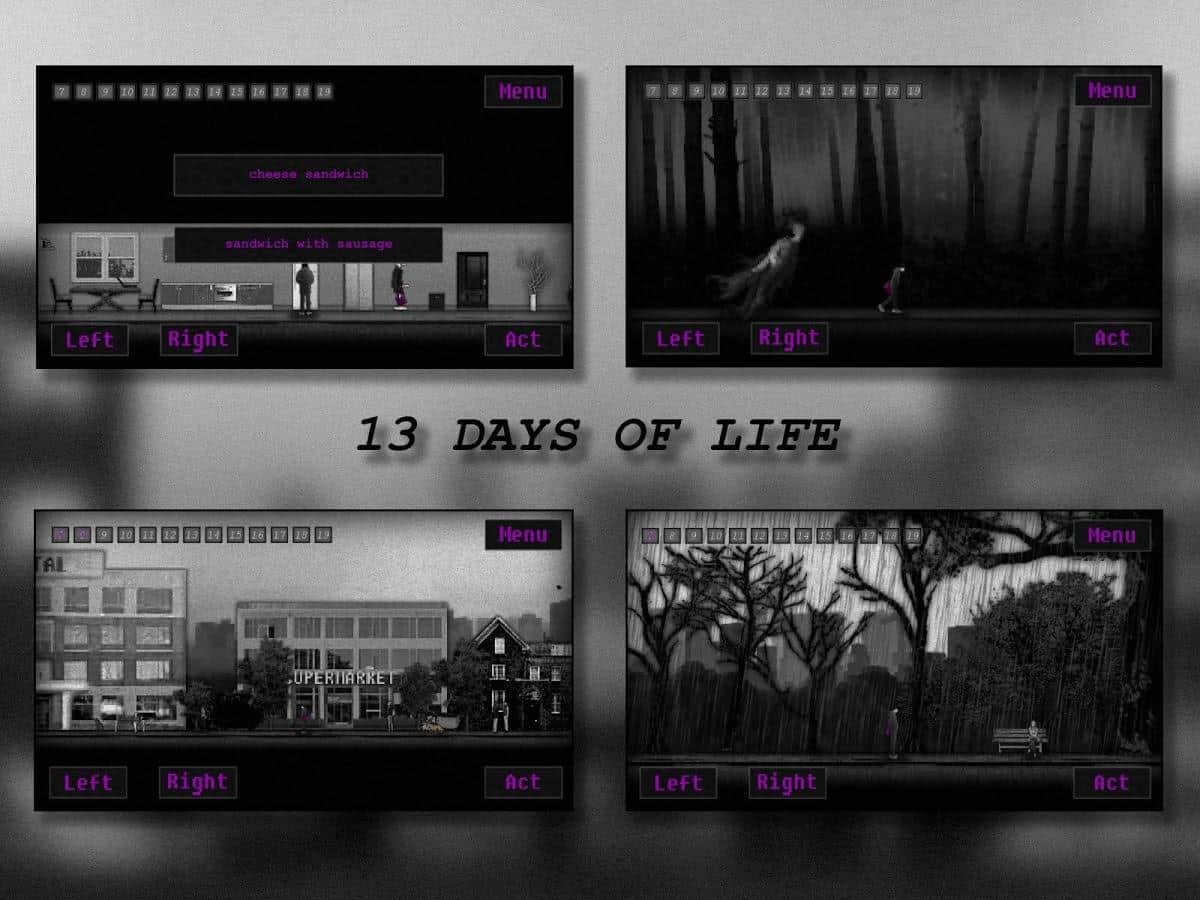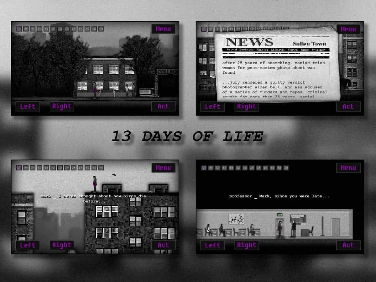 13 DÍAS DE VIDA - EN este juego, los desarrolladores te contarán la historia de un joven llamado Mark. Mark se mudó a otra ciudad para intentar olvidar todo lo que había sucedido en su vida pasada. Para intentar escapar, olvidar todo y comenzar una nueva vida desde cero. Esta es la historia de 13 días no largos pero muy intensos en la vida de Mark.