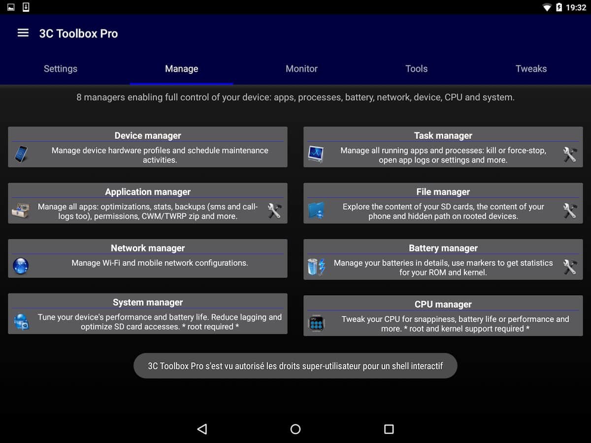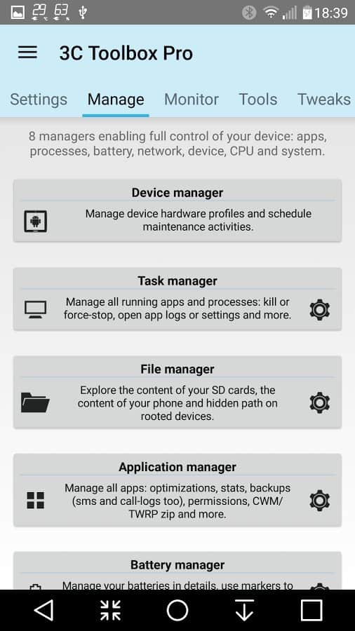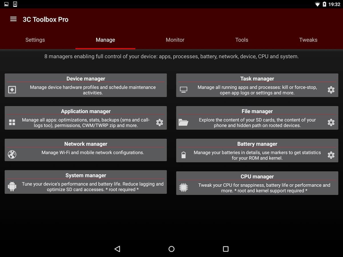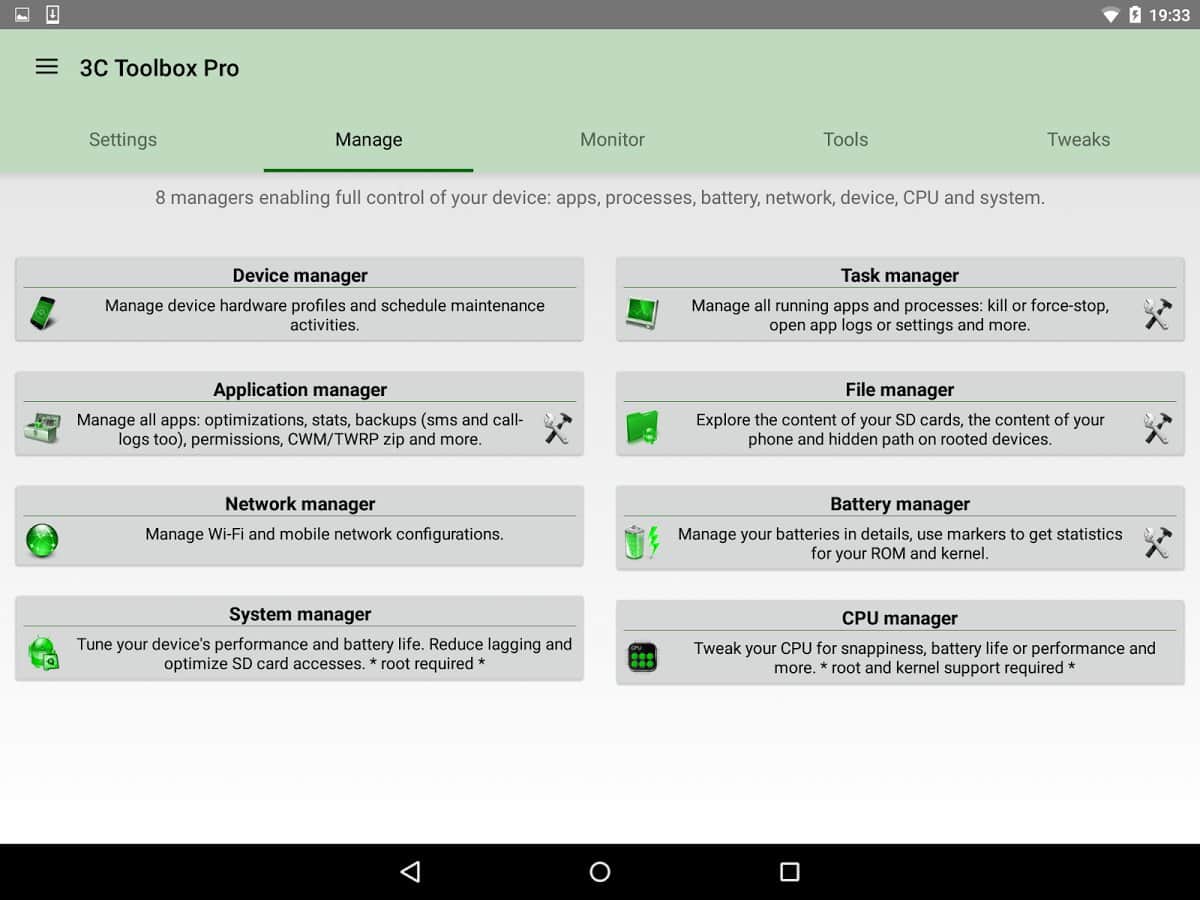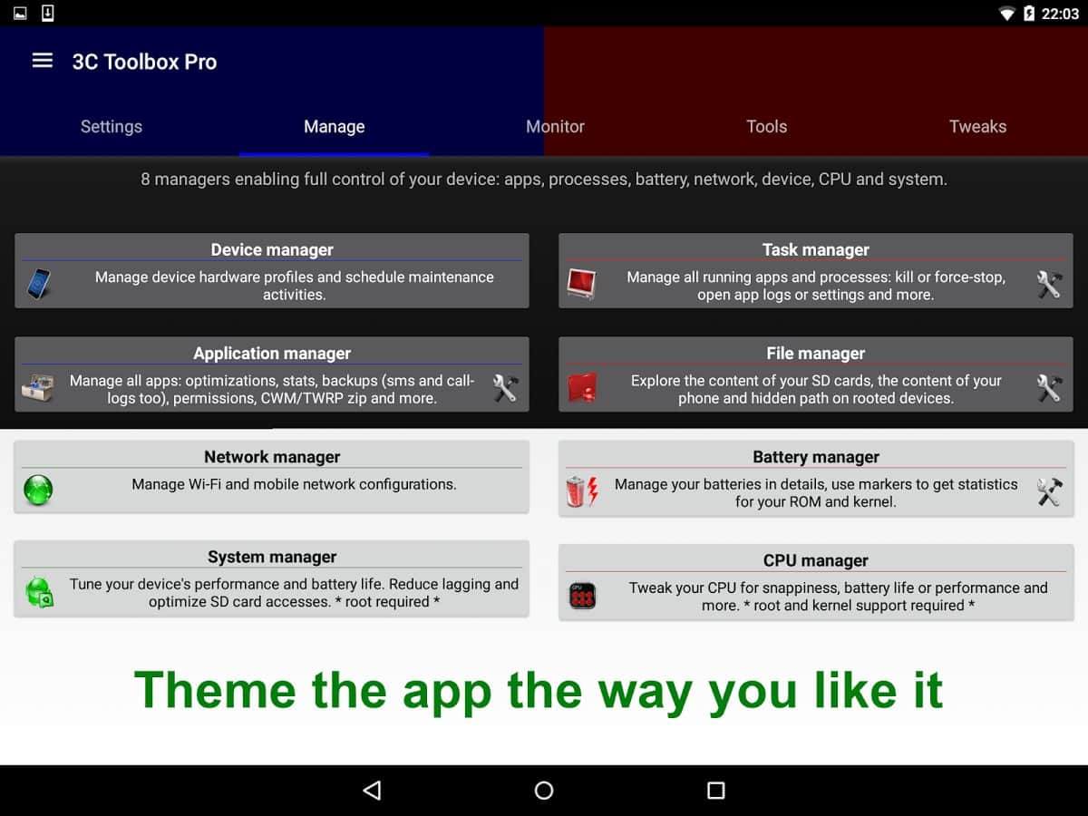3C Toolbox – usando esta aplicación, podrás gestionar completamente todos los aspectos de tu dispositivo. Incluso aquellos que solo están disponibles después de obtener derechos de root, todo está ahí. Configura los botones, el idioma y los temas, personaliza la pantalla de inicio o la temperatura de la CPU. Aquí está todo lo que se puede reunir en una sola aplicación. Es única y combina más de 80 herramientas para la gestión de sistemas del smartphone y sus aplicaciones.
