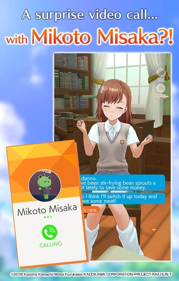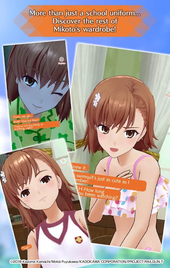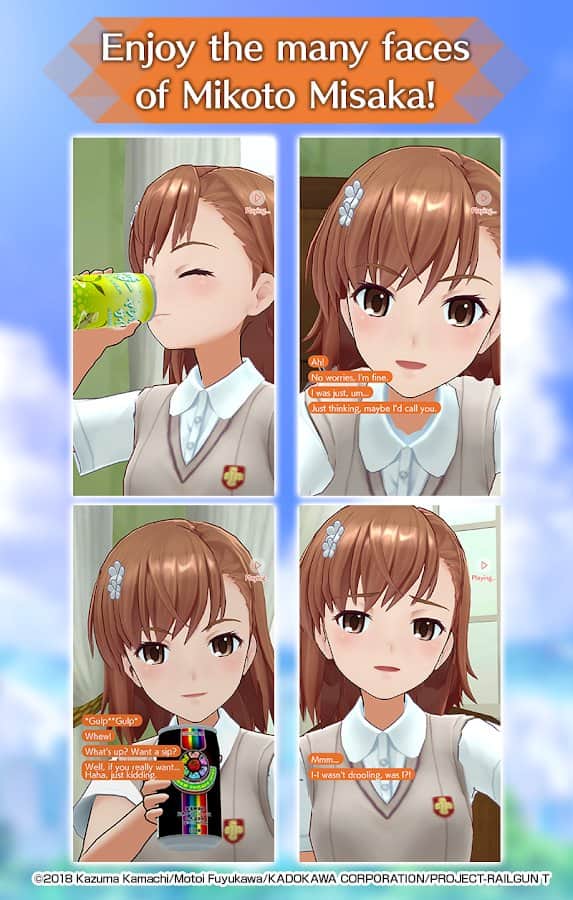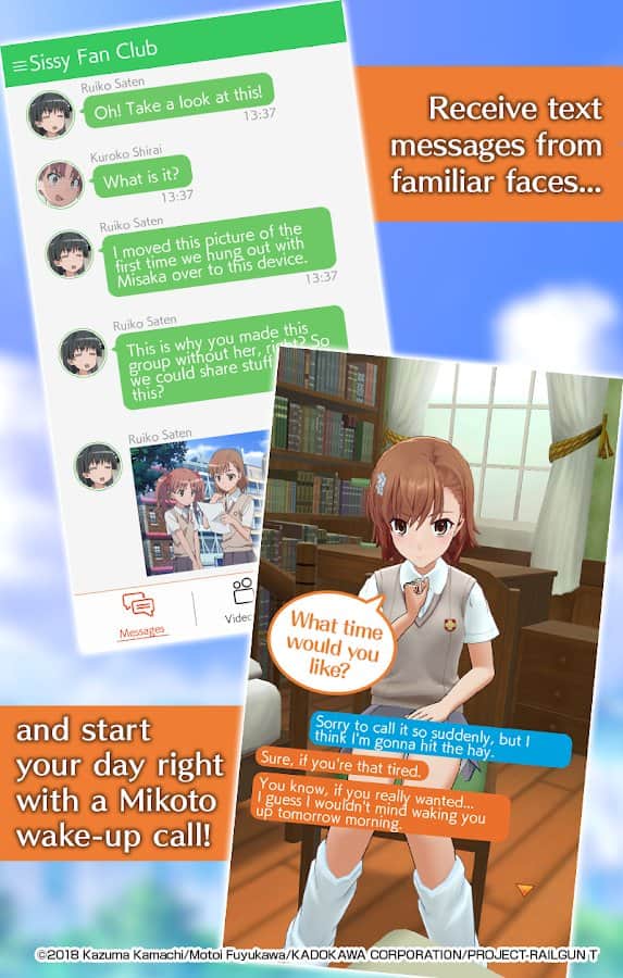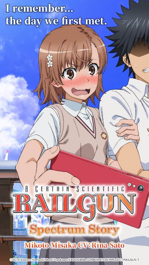 A Certain Scientific Railgun: Spectrum Story - Mantente en contacto con Mikoto Misaka y conócela mejor. Chatea con ella todos los días y lee historias interesantes de su vida. No olvides llamar y ver al personaje principal con diferentes atuendos, dependiendo de dónde se encuentre. Discute cualquier tema en el diálogo, toma las decisiones correctas para desarrollar las relaciones que deseas, escucha algunas respuestas en voz, colecciona fotos de las conversaciones y diviértete: ahora tu círculo de amigos se ha ampliado para incluir a un amigo virtual.