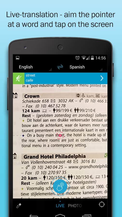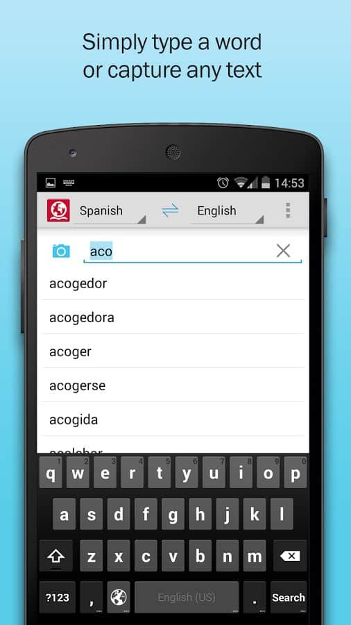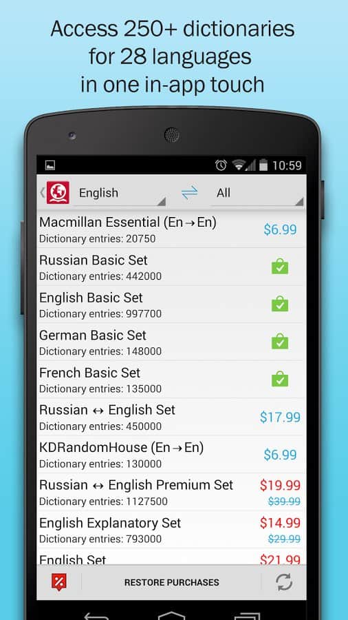 Los Diccionarios ABBYY Lingvo te permiten hacer traducciones de alta calidad de palabras y frases. Posible traducción en varios diccionarios. En la aplicación hay más de 250 diccionarios para traducción y diccionarios temáticos para diferentes idiomas de los cuales un usuario puede traducir fácilmente cualquier texto.