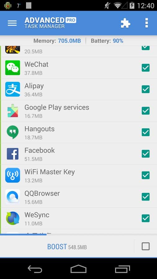Advanced Task Manager – gestor de tareas de software para teléfonos inteligentes y tabletas Android ayuda al dispositivo a lidiar con procesos no deseados o innecesarios de RAM, permitiendo así un funcionamiento más rápido del dispositivo. Si hay una aplicación que no estás usando, puedes eliminarla utilizando el gestor de aplicaciones predeterminado, que realiza una eliminación por lotes. Además, el programa escanea continuamente en modo automático la memoria y las aplicaciones en ejecución, y si es necesario, cierra las que ya no se utilizan. Advanced Task Manager Pro fácilmente ahorra tu batería.