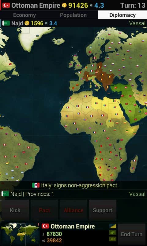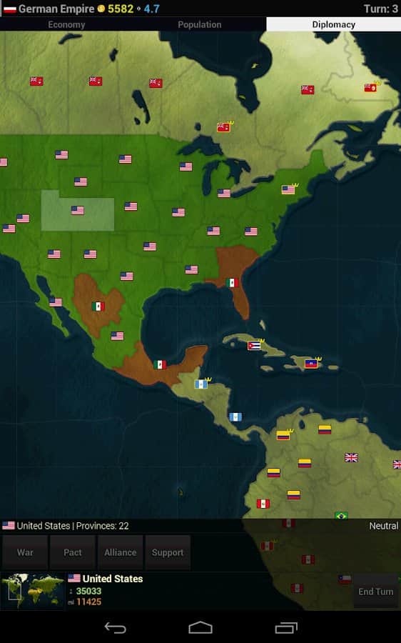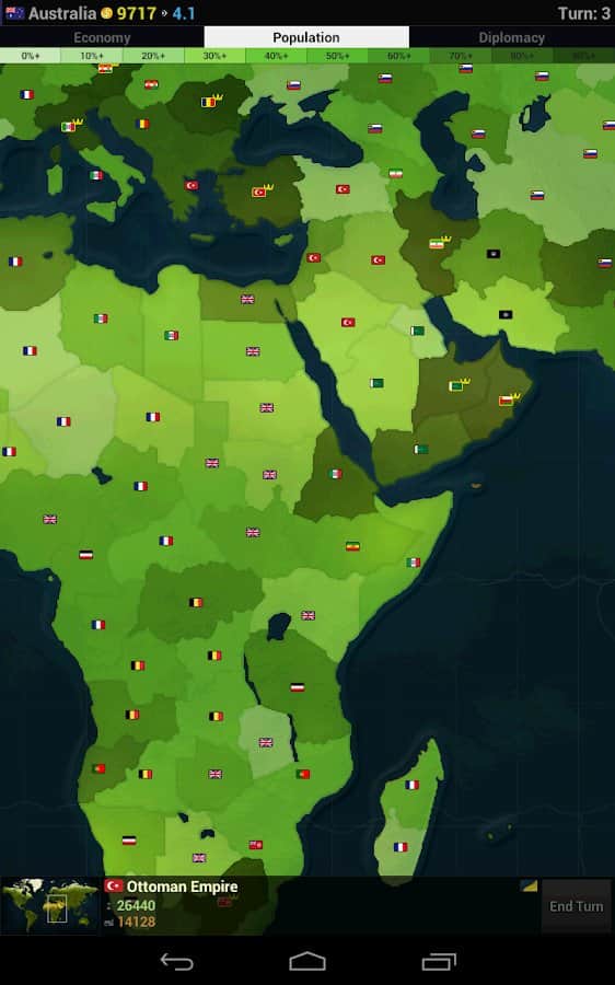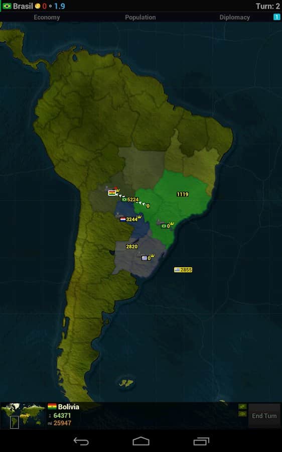 Edad de Civilizaciones - estrategia para Android en la que vas a desarrollar tu país y a apoderarte del territorio de otros. Para empezar, se te dan cartas, en las que puedes ver la población de otros países y sus economías. Las áreas que el mapa no marca en ningún color neutral y podrás obtener. Desarrolla tu país, sigue todos los flujos de efectivo en él y envíalos a lo militar. Dependiendo del tipo de tropas y la cantidad de equipos, se calcula la cantidad correcta de dinero. Da órdenes a tu ejército para moverse a territorios cercanos y atacar a otros países. Forja alianzas con otras civilizaciones y ofréceles asistencia militar en la lucha contra el enemigo. Sigue todos los movimientos del enemigo y no dejes que te capture.