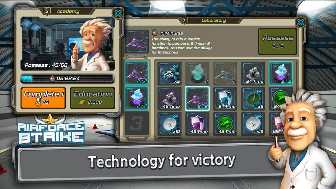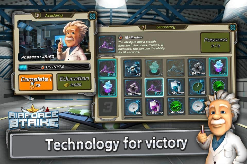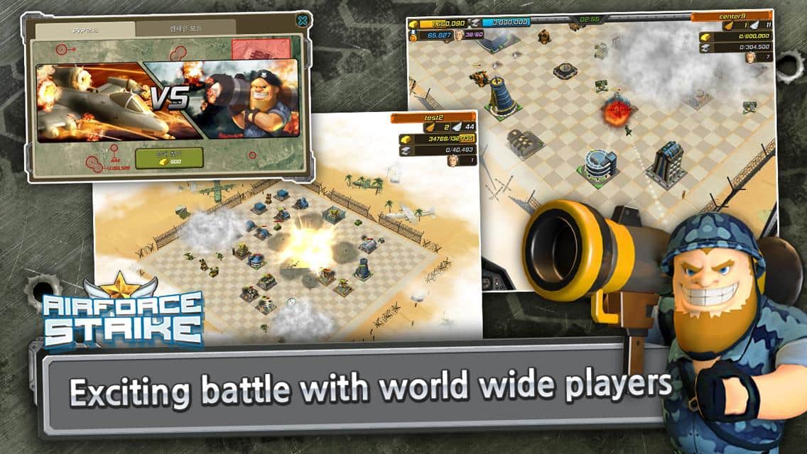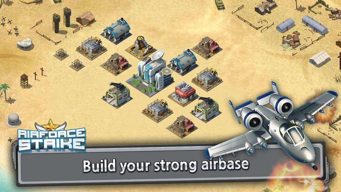 Airforce Strike – estrategia para Android, donde tienes que defender tu base militar de un ataque enemigo. Construye tu base militar y haz todo lo posible para protegerla de los aviones enemigos. Tu principal defensa será el ataque. Envía los bombarderos equipados con poderosas bombas a las posiciones enemigas y destruye su base. Establece tus objetivos y lanza bombas y cohetes en el lugar designado, así como ametrallar a los objetivos con ametralladoras a bordo. Por cada objetivo destruido correctamente recibirás puntos que puedes gastar en la compra de equipo y en la apertura de nuevos bombarderos. Mejora tu base, cuidando cuidadosamente cada objeto.