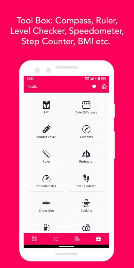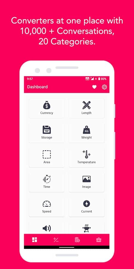 El convertidor de todas las unidades es una herramienta conveniente que te permite convertir fácilmente y rápidamente varias unidades de medida. Cuenta con más de 10,000 conversiones de unidades en 46 categorías, incluyendo moneda, longitud, peso, tiempo, temperatura y otras. Además, la aplicación contiene 12 calculadoras matemáticas, 16 calculadoras financieras y 24 herramientas útiles para la vida cotidiana. Una de las principales ventajas del convertidor es una interfaz de usuario intuitiva que hace que usar la aplicación sea muy simple y agradable. Puedes comparar unidades en un solo lugar, agregar tus unidades favoritas a favoritos y obtener tasas de cambio de moneda en tiempo real para todos los países.