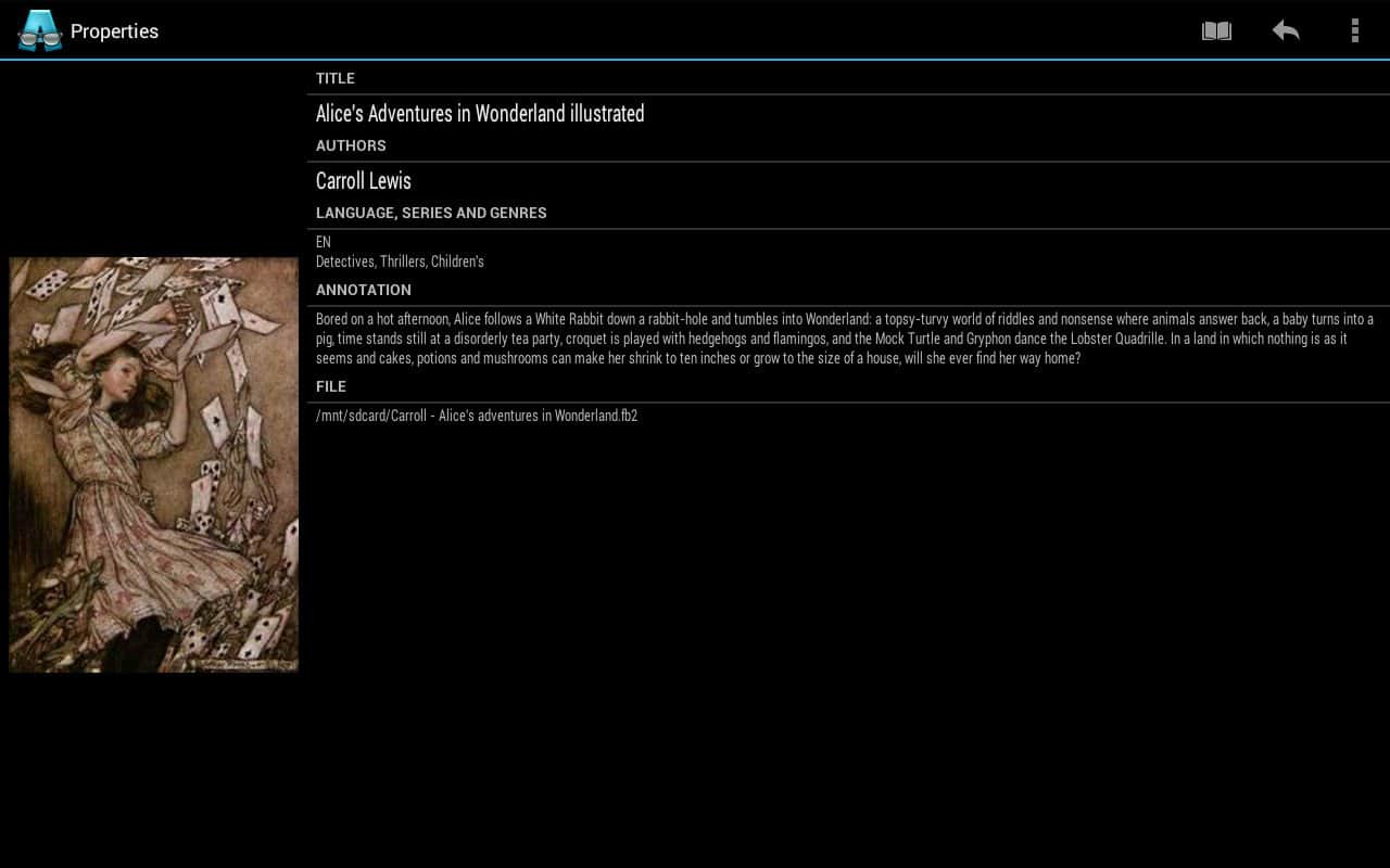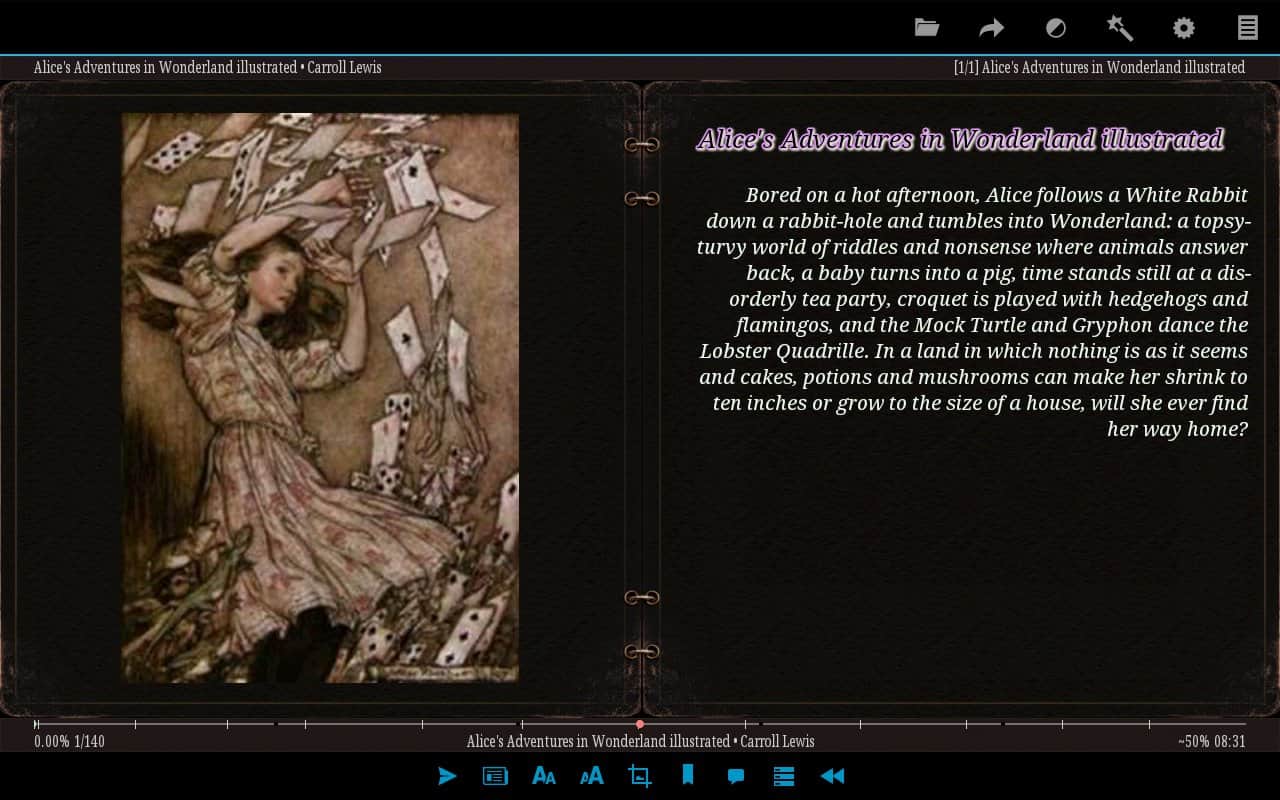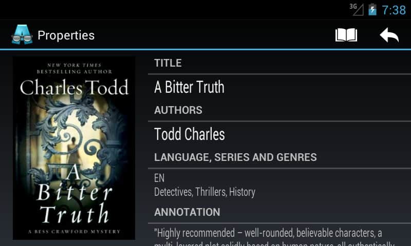 Presume de una interfaz agradable y rápida, soporte para una gran cantidad de formatos (fb2, txt, epub, html, doc, docx, rtf, mobi, etc.) y trabajo con archivos ZIP y GZ, también se incluye TTS.