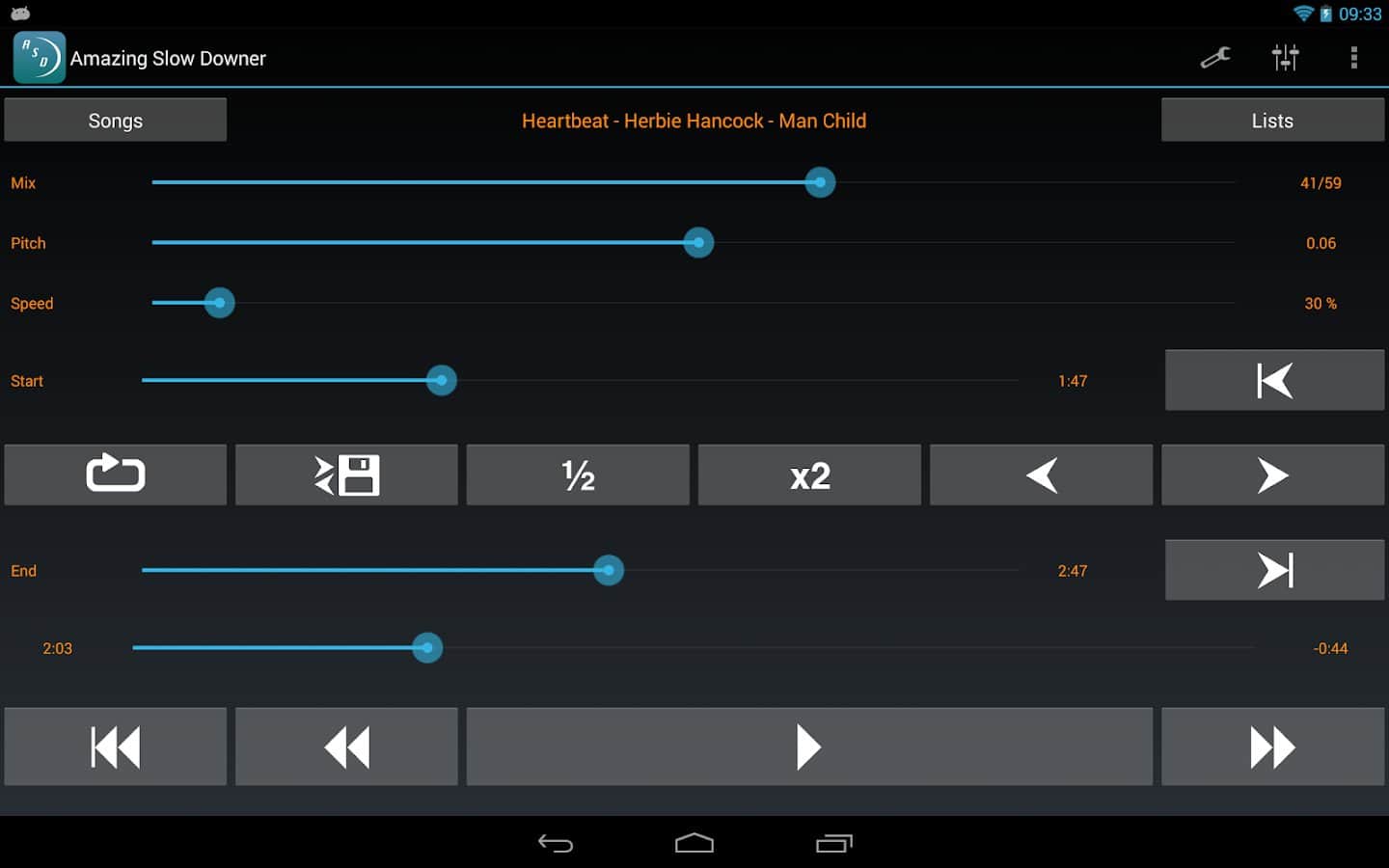 Con Amazing Slow Downer no solo puedes aprender melodías y diversos métodos de ejecución, sino también reproducir una parte determinada de una canción o pista en cámara lenta.