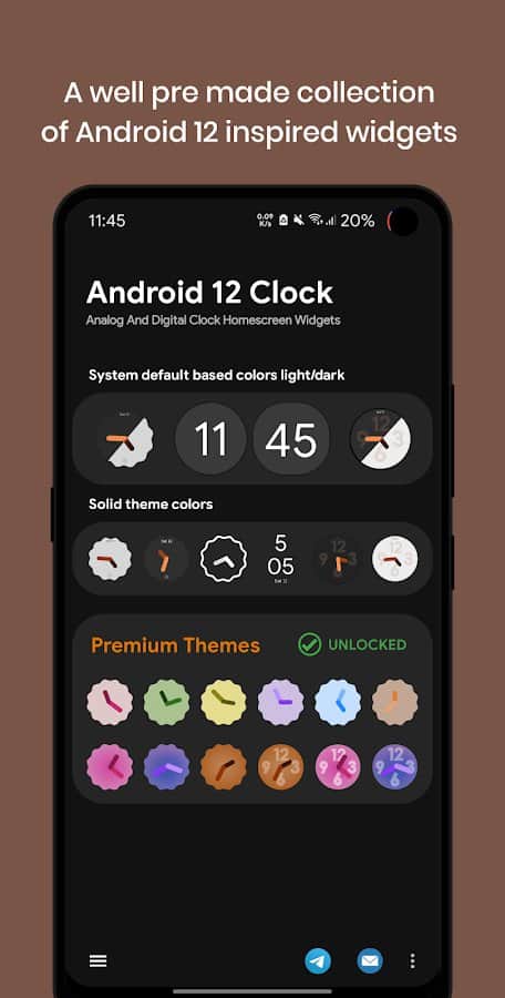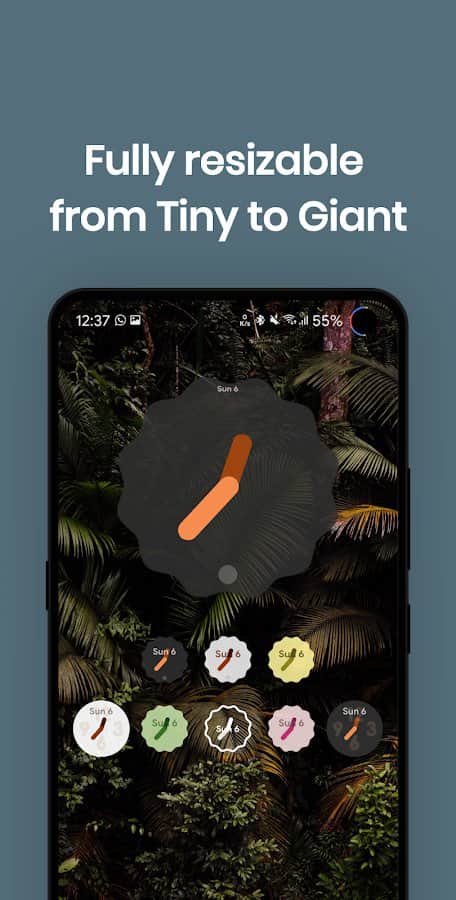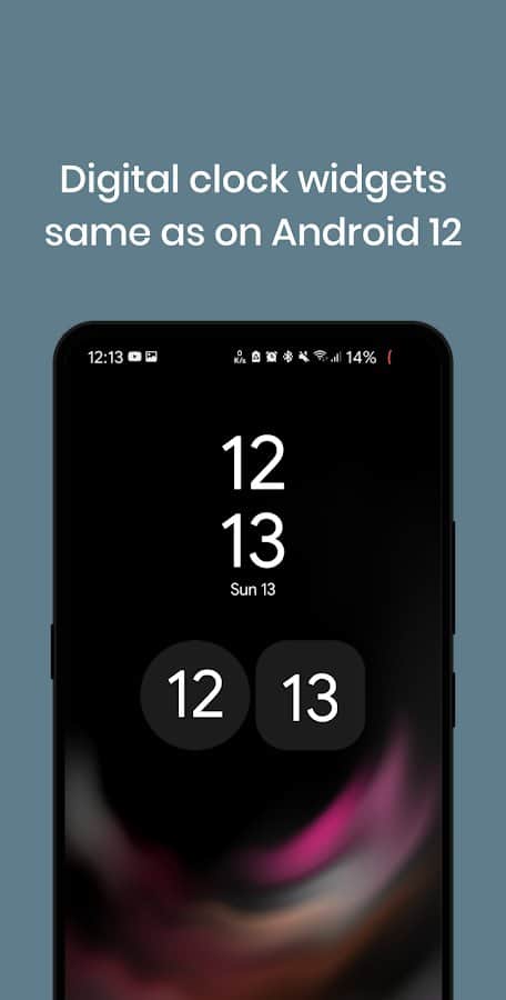 Widgets de Reloj de Android 12 - la versión recientemente lanzada de Android 12 ya ha conquistado a los usuarios con su interfaz actualizada y funcionalidad mejorada. La aplicación de Widgets de Reloj de Android 12 te permite establecer el mismo widget de reloj que en Android 12. Puedes elegir tu estilo de reloj: enmarcado, oscuro, digital, claro o relojes analógicos coloridos con un diseño único. No se necesitan descargar permisos, aplicaciones u opciones adicionales. ¡El widget orgánico y de diseño será una verdadera decoración para tu pantalla!