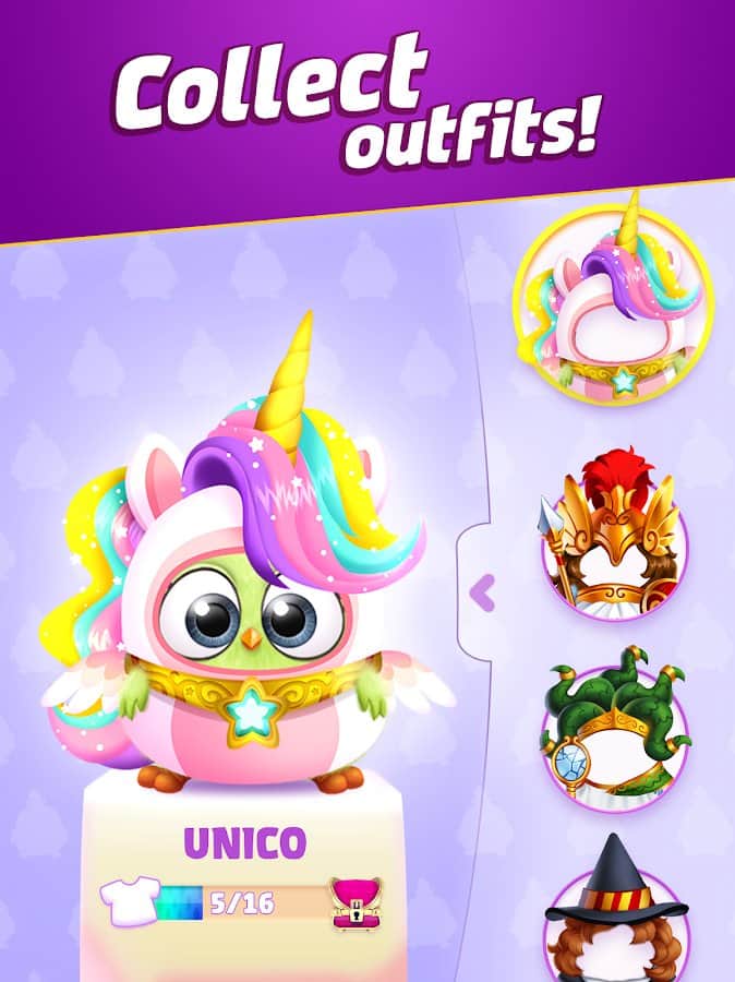 – Nueve atuendos únicos — tres para cada polluelo — que se pueden desbloquear durante el juego!