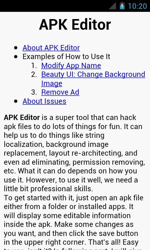 APK Editor Pro es una herramienta poderosa que puede editar / hackear archivos APK. Con esta aplicación podrás localizar tu juego favorito en cualquier idioma del mundo, reemplazar el fondo, el diseño, realizar cambios arquitectónicos y mucho más interesante.