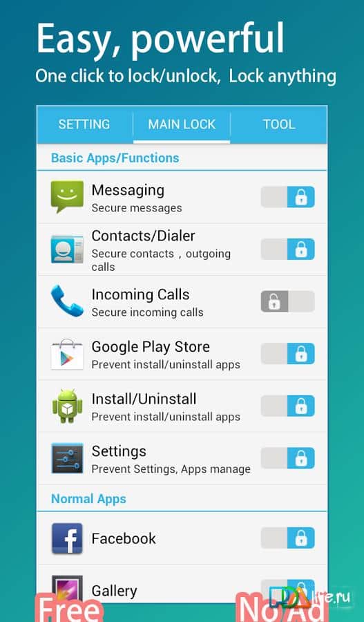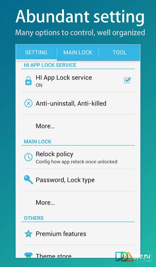 App Lock (HI App Lock) para Android del desarrollador Hi App Team. Gran y útil aplicación, que tiene características como bloqueo de pantalla con un toque, crear tres perfiles para elegir (así que el teléfono en manos de un niño, no es un problema), la capacidad de protegerte a ti mismo y a tu teléfono de la eliminación no deseada de cualquier información mediante el establecimiento de una contraseña (incluyendo a una aplicación separada) y mucho más. Disfruta.