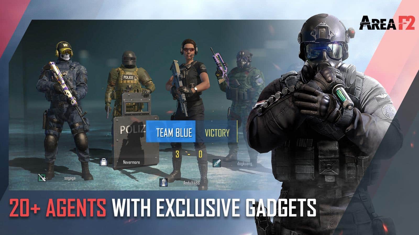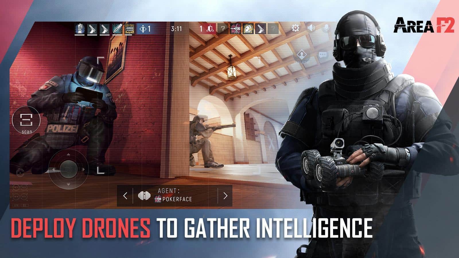 Area F2 es el primer FPS de combate en espacios cerrados para dispositivos móviles. Elige uno de más de 20 agentes, cada uno con sus propias habilidades especiales, y ataca o defiende en un entorno increíblemente realista. Cualquier techo o pared puede ser reforzado o, por el contrario, destruido. El juego exige a los luchadores mostrar una habilidad y astucia táctica notables, porque el enemigo puede abrirse paso a través de cualquier pared. Instala y abre fuego con una ametralladora para suprimir, derriba esa pared con una flecha de una ballesta o coloca en el punto de entrada supuesto una mina de trampa. Lanza drones para encontrar objetivos, o desactiva la señal del enemigo para pasar desapercibido. Quien gana la guerra de la información, está a medio camino de la victoria.