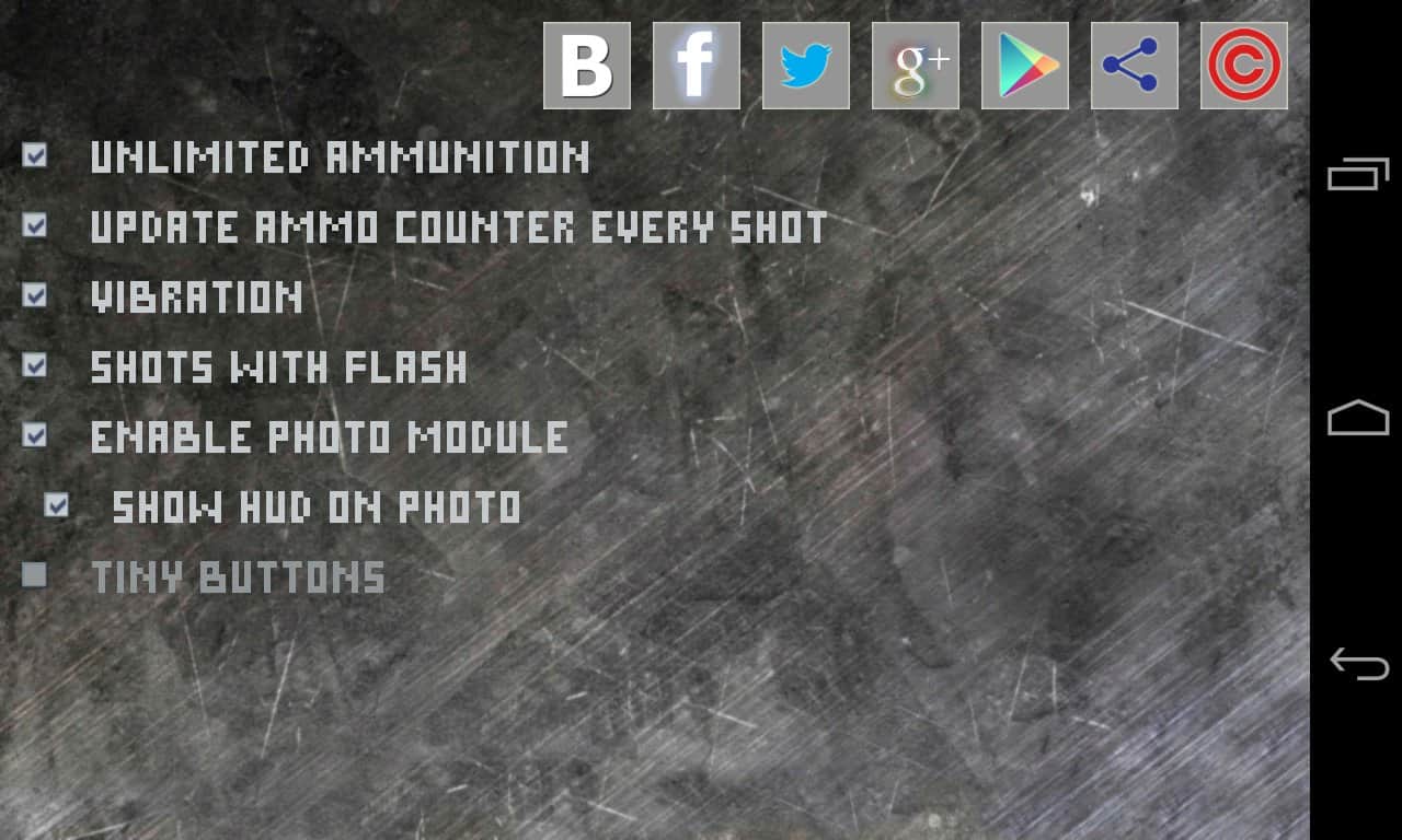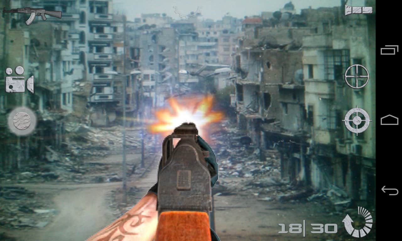 Armed Cam – un divertido juego en estilo arcade (neumático) para tu dispositivo Android que te permitirá aliviar el estrés después de un día difícil. Toma una foto con tu cámara y únete a la destrucción del infractor o del enemigo. Quién, cómo y qué matar tú decides. El juego Armed Cam ofrece en este sentido, simplemente una enorme cantidad de armas. Las imágenes creadas se pueden compartir con amigos a través de correo electrónico, Facebook, Twitter, WhatsApp, Gmail, Google +, Instagram, AllShare, Bluetooth, Cymera, Drive, mensajería, editor de fotos, Picasa, Social Hub, Wi-Fi. ¡Bonita forma de aliviar el estrés!