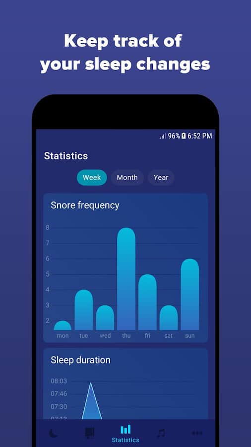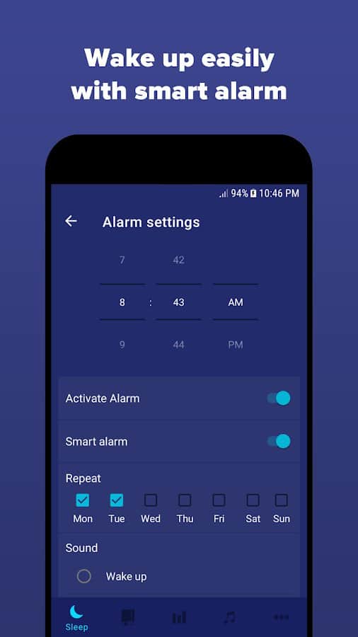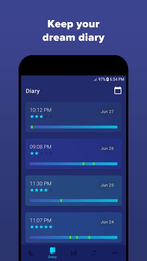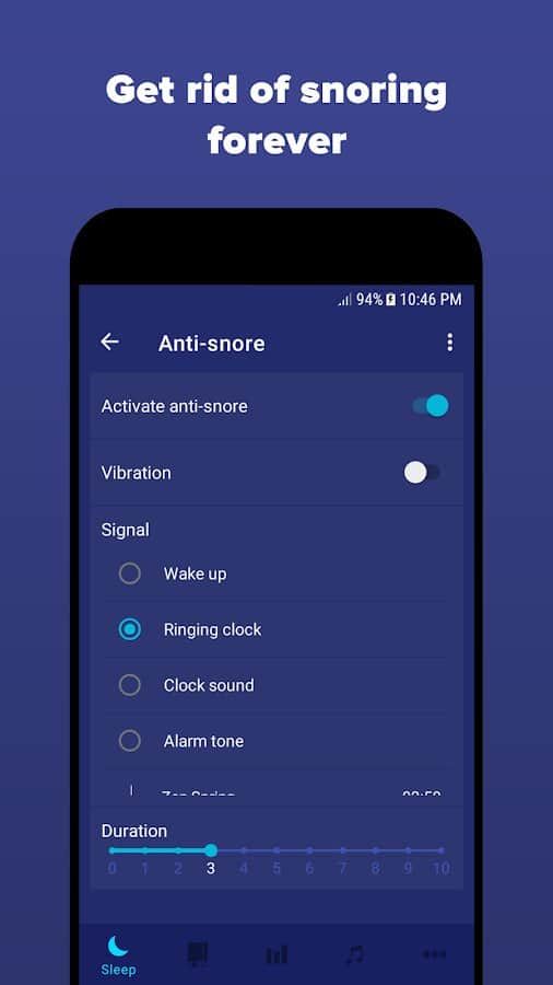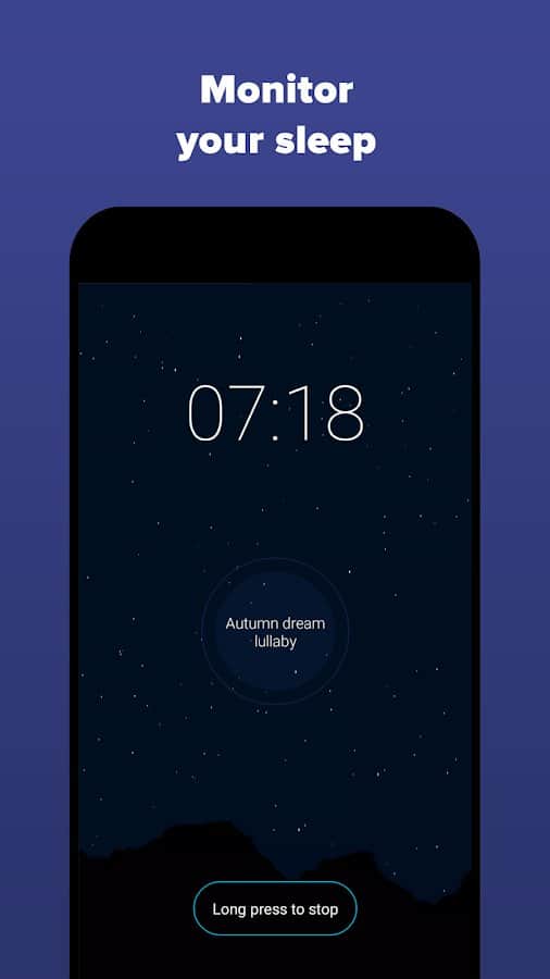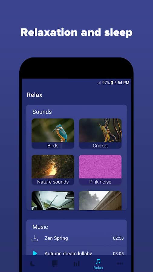 Si no puedes dormir después de un día duro y ajetreado, la aplicación te ayudará con esto. Relájate bajo los agradables sonidos para dormir o meditar, activa la función "anti-ronquido" y no podrás dejar de calmarte rápidamente y dormir. Instala "Alarma inteligente", pon grabaciones de sonidos nocturnos, para ayudar a monitorear tu sueño y los intervalos de sueño, elige la fase de sueño adecuada, guarda los datos importantes de este monitoreo. Así podrás comprobar los factores que afectan la calidad de la relajación y el sueño, y elegir los mejores sonidos relajantes de diferentes géneros.