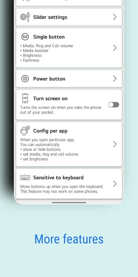 Botón de Volumen Auxiliar - ¡Guarda los botones de volumen en la pantalla de tu propio teléfono para aumentar o disminuir el sonido en cualquier momento! Cambia el tamaño, color, transparencia, estilo y otros parámetros de la apariencia de los controles deslizantes, así como coloca el panel en una parte conveniente de tu smartphone. Además de acceder a todas las funciones, como encender el volumen máximo o bajar al brillo mínimo, puedes mostrar solo un botón al que, al hacer clic, abrirás un panel completo con posibilidades de uso.