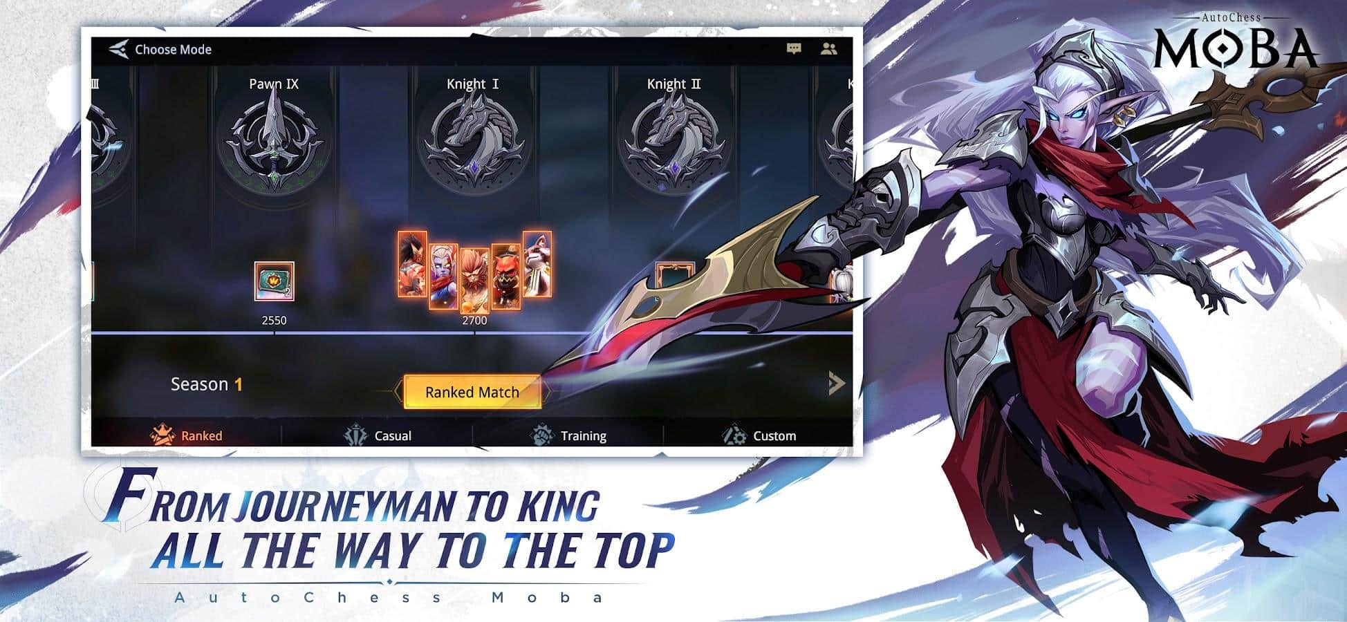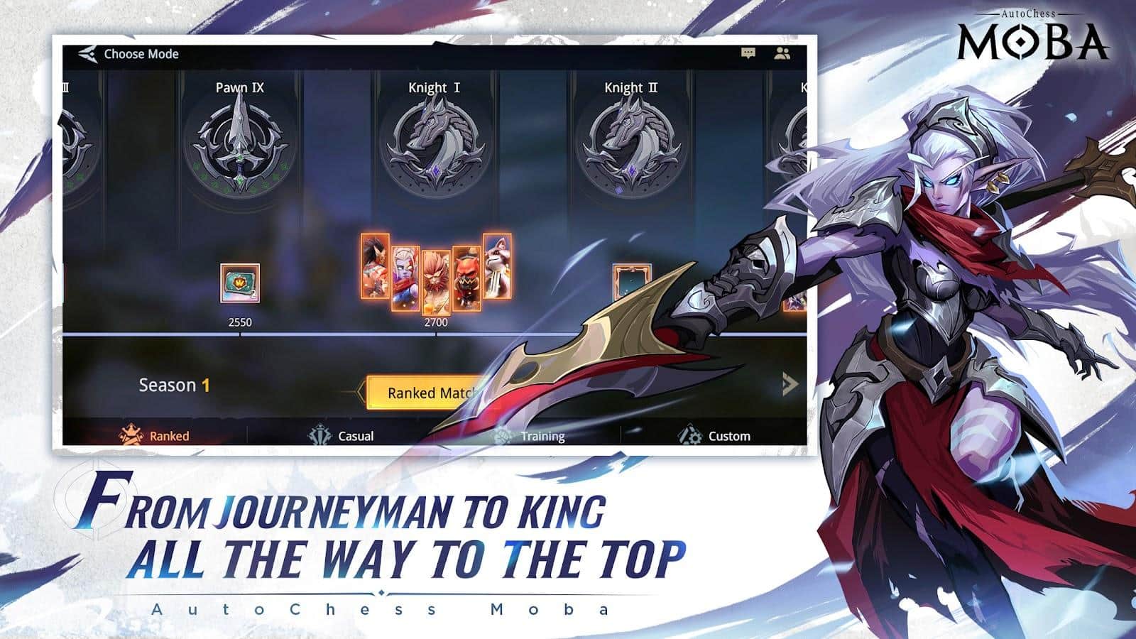 AutoChess Moba - Muestra todo tu potencial oculto en la arena. Gracias a las luchas, especialmente si son 5 contra 5, podrás escalar la escalera de la carrera desde el estatus de Aprendiz hasta la posición más alta: el Rey. Además, descubre los mejores y peores lados de los personajes, entre ellos estarán: top laner, segador de flanqueo, trampa rápida y otros.