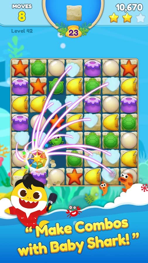Baby Shark Match: Ocean Jam – un fascinante juego del género tres en raya donde te encontrarás en el fondo del mar y conocerás a muchos de sus habitantes. En este juego, tu tarea principal es hacer filas de tres o más objetos y divertirte pasando tu tiempo libre. Empareja medusas, estrellas de mar, tortugas y peces y obtén grandes recompensas y bonificaciones. Explora los cinco modos de juego y elige el que mejor se adapte a tu estilo de juego. Recoge tantos tesoros como sea posible y desbloquea nuevos amigos.
