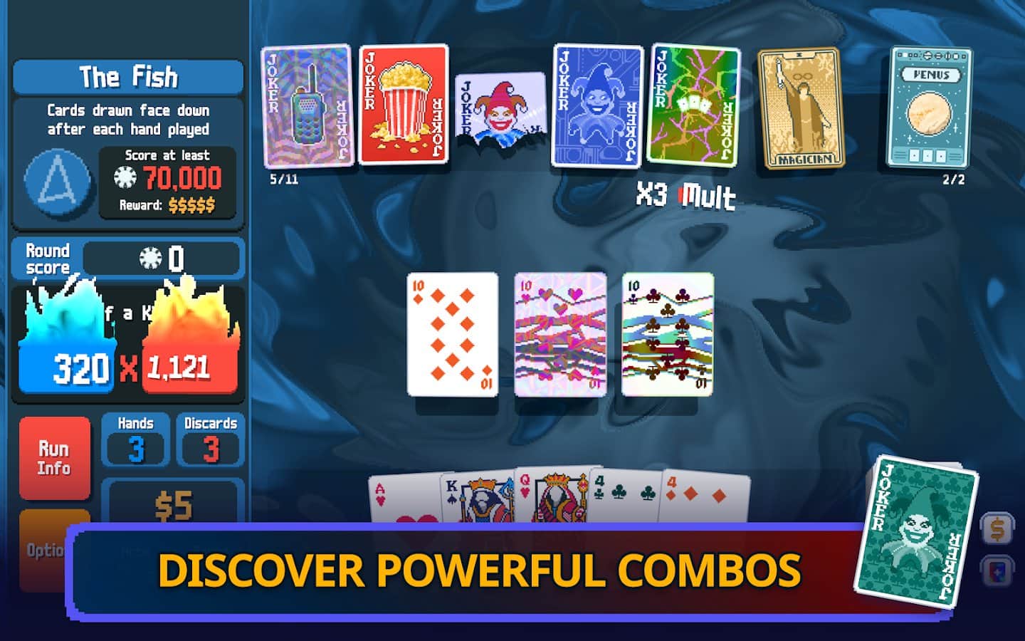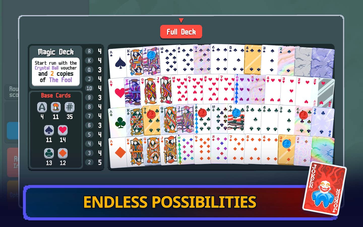 ¡Bienvenido al juego móvil oficial Balatro! Tu misión es derrotar al jefe ciego recogiendo poderosas combinaciones de póker. Desbloquea nuevos comodines que cambiarán el curso del juego y crea combinaciones impresionantes. Gana suficientes fichas para derrotar a jefes fuertes y descubrir combinaciones y mazos de bonificación ocultos durante el juego. ¡Únete al juego Balatro y experimenta toda la riqueza de estrategias y diversión que ofrece!