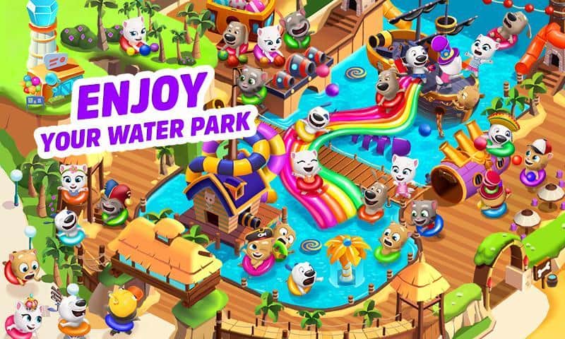 la Piscina Talking Tom es un juego adictivo y divertido en Android, donde tú junto con Talking Tom y sus amigos van al parque acuático. Comienza tu aventura ahora mismo y chapotea en la piscina con los otros personajes y haz que se golpeen entre sí. Este juego te deleitará con la mecánica única "tirachinas" donde tirarás del aro de goma para soltarlo y así empujar los otros círculos del mismo color. Tu tarea será limpiar toda la piscina de la comunidad en el menor tiempo posible y ganar la llave. Consigue la ayuda de bonos y potenciadores en forma de cohetes y el círculo del unicornio, que te permitirán completar el nivel rápidamente. Usa las pistas para construir, mejorar o abrir un nuevo parque acuático. Chapotea en la piscina con personajes como Talking Tom, Angela, Hank, Ben y Gingery y disfruta de su tiempo libre.