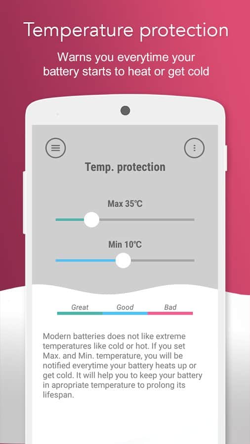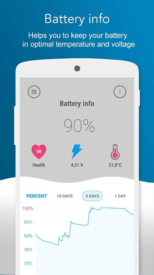 Extensor de Vida de Batería - Mantén tu batería en buen estado con una aplicación simple. La carga y descarga máxima de la batería puede arruinarla, y pocas personas lo saben, pero la batería también tiene sus modos de operación. Estos modos se pueden controlar manualmente con la ayuda de esta aplicación, para monitorear su rendimiento y prevenir el sobrecalentamiento. Nuestra aplicación te ofrece una visión general del nivel de carga y temperatura de la batería, así como información sobre el estado de la batería, su voltaje y temperatura en tiempo real.
