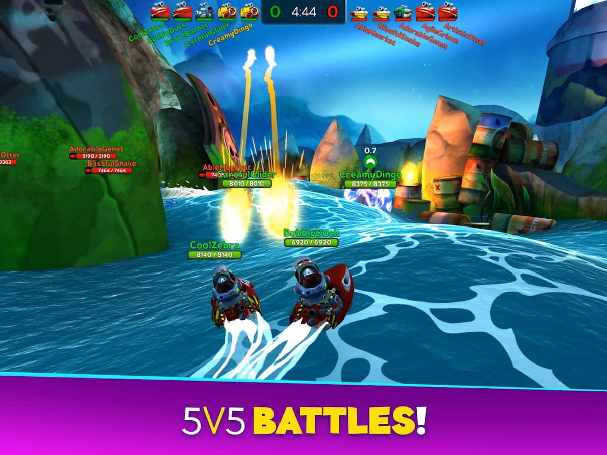 Battle Bay - un gran juego del desarrollador "Rovio". Batallas navales multijugador en equipo en tiempo real. ¡Selecciona el barco para unirte a las fuerzas y destruir al enemigo! El juego tiene varios tipos de barcos, cada uno con un propósito diferente. Uno puede infligir golpes devastadores, el otro es un defensor, el tercero lleva más armas y así sucesivamente. Únete a la Guilda y tendrás acceso a nuevas áreas. Antes de las batallas, elige el arsenal de armas que usaremos en la batalla contra el enemigo. ¡Disfruta del juego!