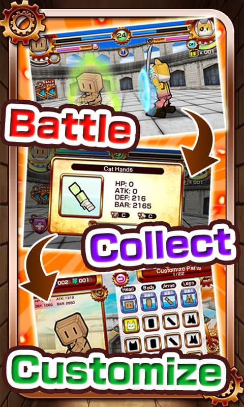 ¡Robots de batalla! - un juego de la desarrolladora Kuma the Bear para dispositivos Android. Destruye sin piedad a los robots enemigos, pero sin olvidar la resistencia de tu luchador. El juego cuenta con 120 niveles, a los que definitivamente debes llegar para ganar. Un control sencillo y gráficos en 3D seguramente alegrarán incluso al jugador más perezoso y exigente. Destruye a tus oponentes y recoge las piezas que vuelan de los robots enemigos. Más adelante te serán útiles para mejorar a tu gladiador de hierro. Y tendrás que recoger muchas, ya que el desarrollador ha destacado un total de 429 piezas diferentes, que incluyen: cabeza, cuerpo, brazos, piernas y lo más importante, ¡armas!