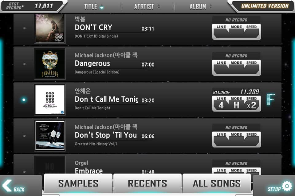 BEAT MP3 - Juego de música cautivador para Android en el que tocas música. Delante de ti hay cuatro carriles. Para estos carriles moverás las fichas que necesitas presionar cuando lleguen a la plataforma inferior. Algunas de ellas no solo necesitan ser clicadas, sino también dirigidas en la dirección correcta. Antes del juego, puedes ajustar la intensidad y la velocidad de las fichas.