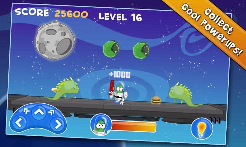 Bert En El Espacio - un divertido juego de arcade para android sobre las aventuras de un pequeño alienígena llamado Burt. En una cruel coincidencia, Burt llegó tarde a la nave espacial, que debía volar con sus padres para relajarse. Dejado en la plataforma de lanzamiento, el bebé comenzó a ser perseguido por alienígenas saltadores poco amistosos. Pero nuestro héroe no se dio por vencido y huyó. Escondiéndose, Burt encontró una antigua armadura, equipada con armas y motor. Sin pensarlo, Burt se pone el traje y decide convertirse en un luchador contra los malvados criminales, ¡llamándose a sí mismo el Bertonator! Aquí te esperan divertidas aventuras en este juego. ¡Y muchos bonos, diferentes misiones y tabla de líderes!