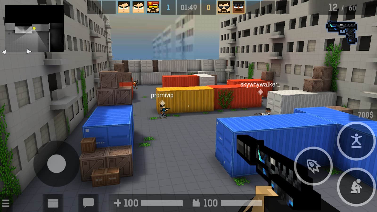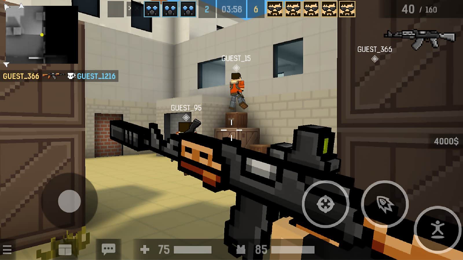 En el juego BLOCKPOST MOBILE te sumergirás en un mundo cúbico de píxeles donde tendrás que sobrevivir y disparar a los enemigos que están a cada paso. Elige tu arma (cuchillos, pistolas, ametralladoras, escopetas, rifles, granadas, etc.) y mejórala mediante una ampliación de mejoras. Abre cajas gratuitas, consigue nuevas skins, gasta bonificaciones en la compra del equipo y artículos necesarios en la tienda. Participa en múltiples modos de juego: desactivación de la bomba, la competencia en equipos de francotiradores. Gráficos realistas y sofisticados involucrarán al jugador en el juego.
