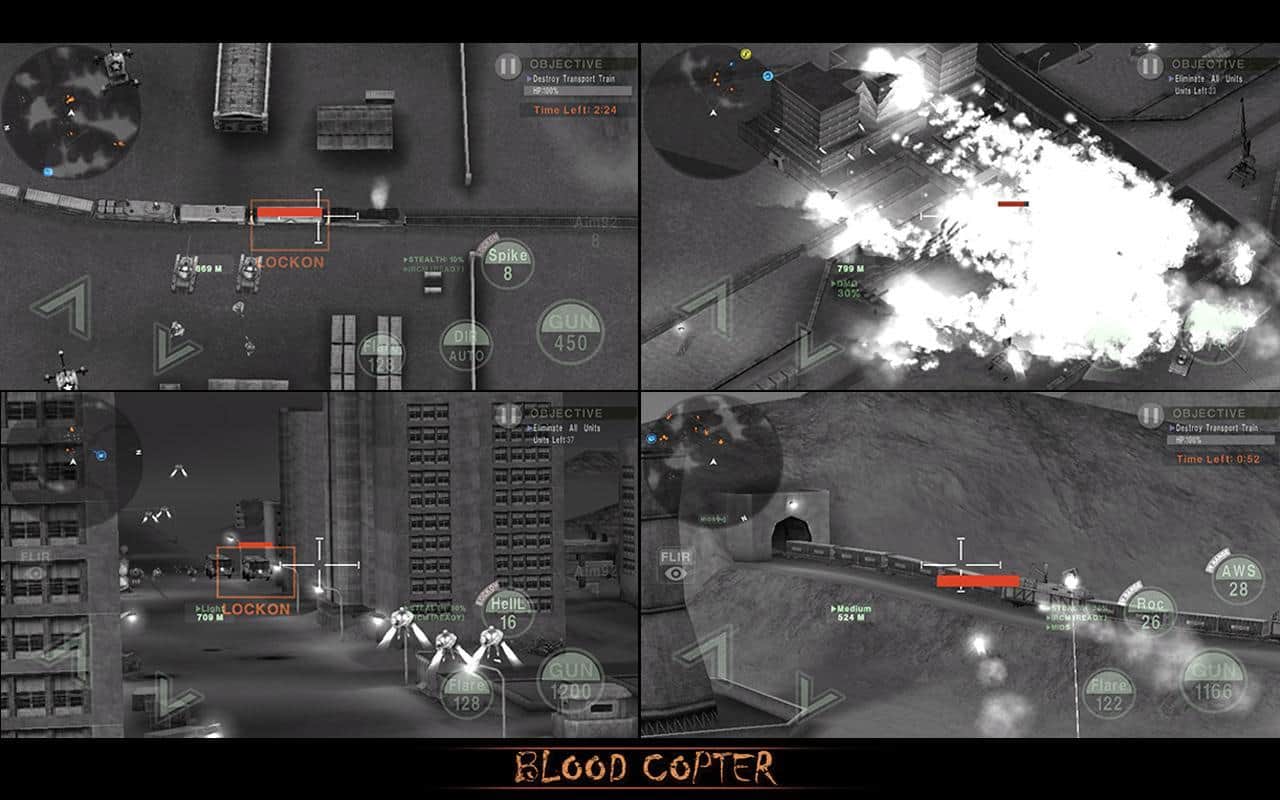 BLOOD COPTER – un fascinante shooter para Android donde controlas un helicóptero de ataque. En este juego tomarás el control del helicóptero y llevarás a cabo una peligrosa misión para destruir una empresa farmacéutica que amenaza al mundo con armas biológicas. Controla el helicóptero y completa misiones de combate participando en batallas aéreas. Usa el radar para detectar la ubicación del enemigo y su destrucción. Obtén recompensas y títulos por cada misión completada con éxito y mejora tu helicóptero. Usa bombas y misiles para destruir la base enemiga y hundir todos sus barcos.