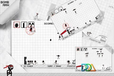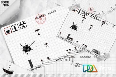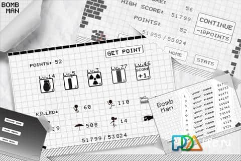 Bomb Man para Android - y de nuevo el cuaderno en la caja, como en la escuela secundaria. La idea es simple y compleja al mismo tiempo. Necesitarás proteger tu territorio de los ataques de las fuerzas enemigas: soldados, tanques, bombas atómicas y destructores. ¡Atacan por turnos y todos a la vez! Tu tarea es lanzar las bombas enemigas a tiempo. ¡Cuanto más avanzas, más difícil y fuerte es tu oponente! Cuanto mejor sea tu juego, más puntos obtendrás, ¡así que mejora tus armas en tu bolsillo! Además, es posible mejorar, es decir, fortalecer la pared protectora, que también está conteniendo el asalto del enemigo. Y además, ¡ten cuidado con el enemigo y elige el mejor tipo de bombas, desde granadas hasta atómicas! Bueno, ¡parece que todos juegan y disfrutan de esta arcade dibujada a mano!
