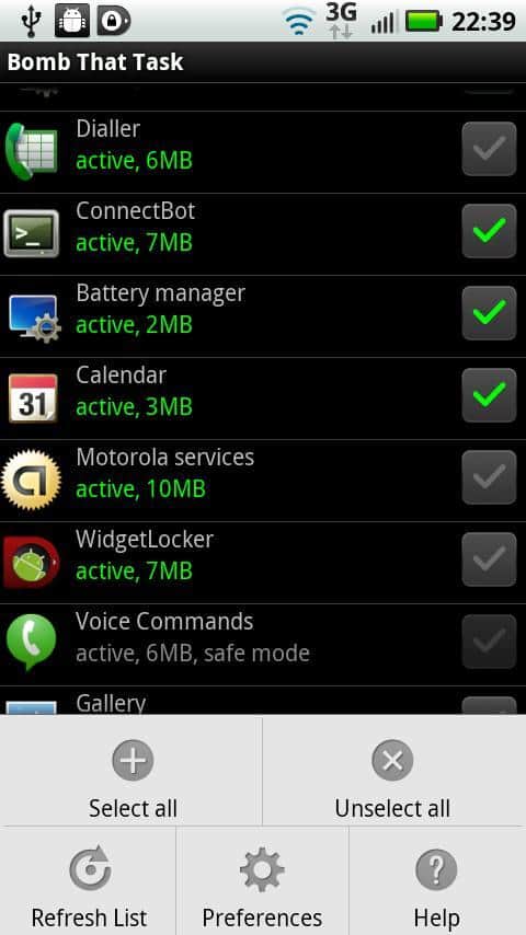 Bomb That Task - la aplicación cumple totalmente con su nombre. Realmente es el administrador de tareas para tu smartphone, que desactivará todo lo que no te guste del proceso. Sin embargo, al desactivar el proceso un poco, también podrás personalizar su funcionamiento para que, cuando esté en modo de suspensión, los procesos innecesarios se apaguen. Y esto ahorrará considerablemente la vida de tu batería. Todo se mostrará en una lista simple y conveniente, y los procesos activos se resaltarán. Podrás establecer prioridades o cerrarlos en masa, seleccionando previamente algunos de ellos.