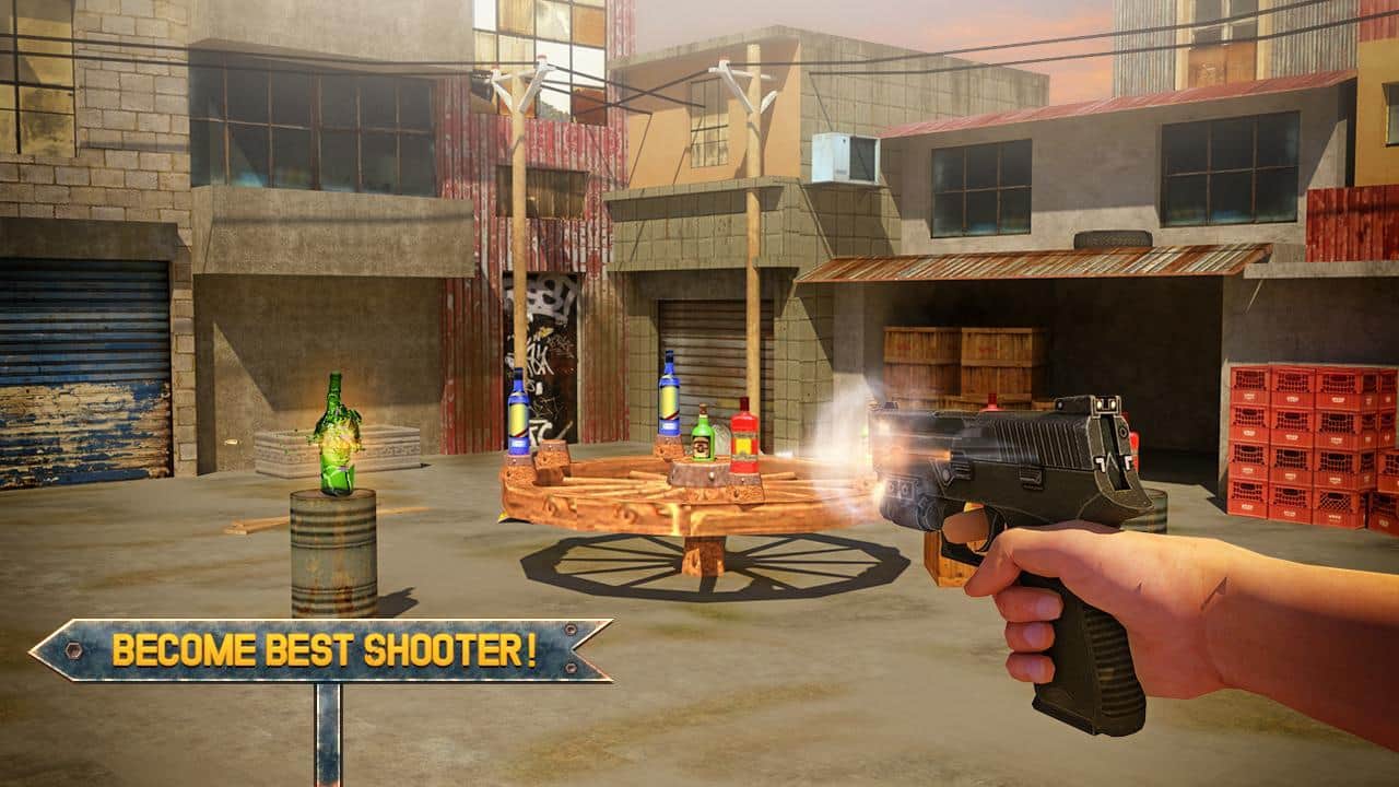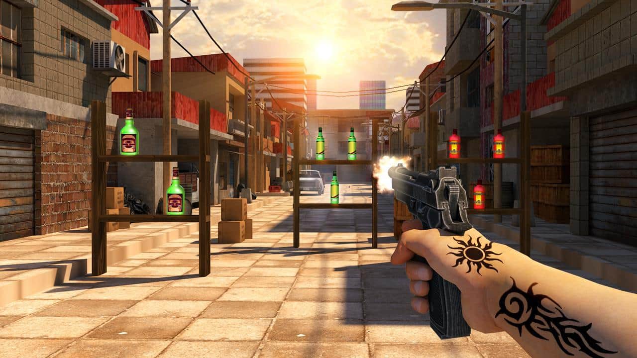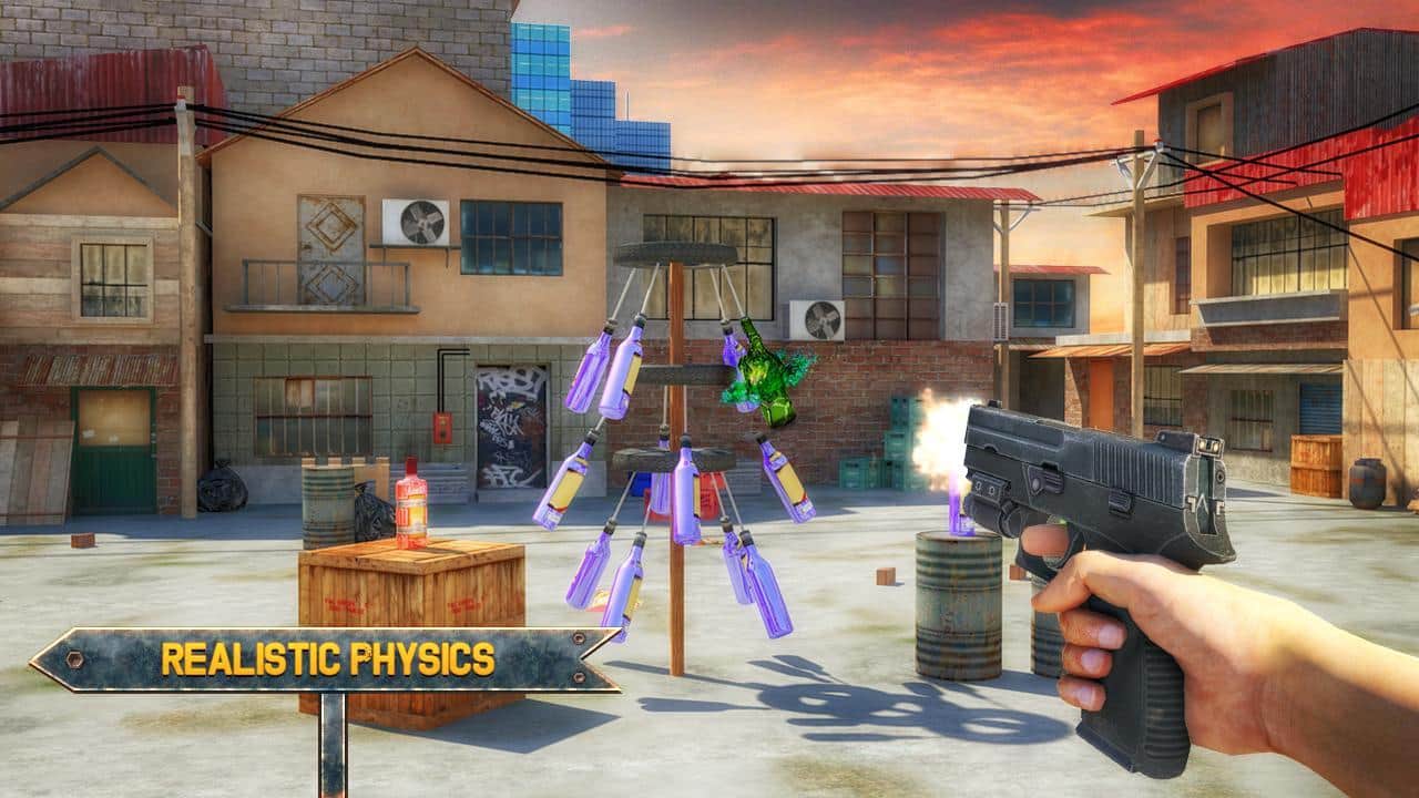Juego de Tiro de Botellas 3D Experto – juego para Android donde dispararás a las botellas. Apunta y lanza el gancho de tu arma y rompe una botella tras otra. Muestra todas tus habilidades en el tiro al blanco. Con un solo toque de un dedo en la pantalla sobre el objetivo, realiza el disparo. Con cada nuevo nivel, la dificultad del juego aumentará y tendrás más dificultades para acertar a los objetivos. El juego añadirá numerosos obstáculos y un objetivo en movimiento. Descubre nuevas misiones y gana suficientes puntos, convirtiéndote en un maestro del tiro con pistola.
