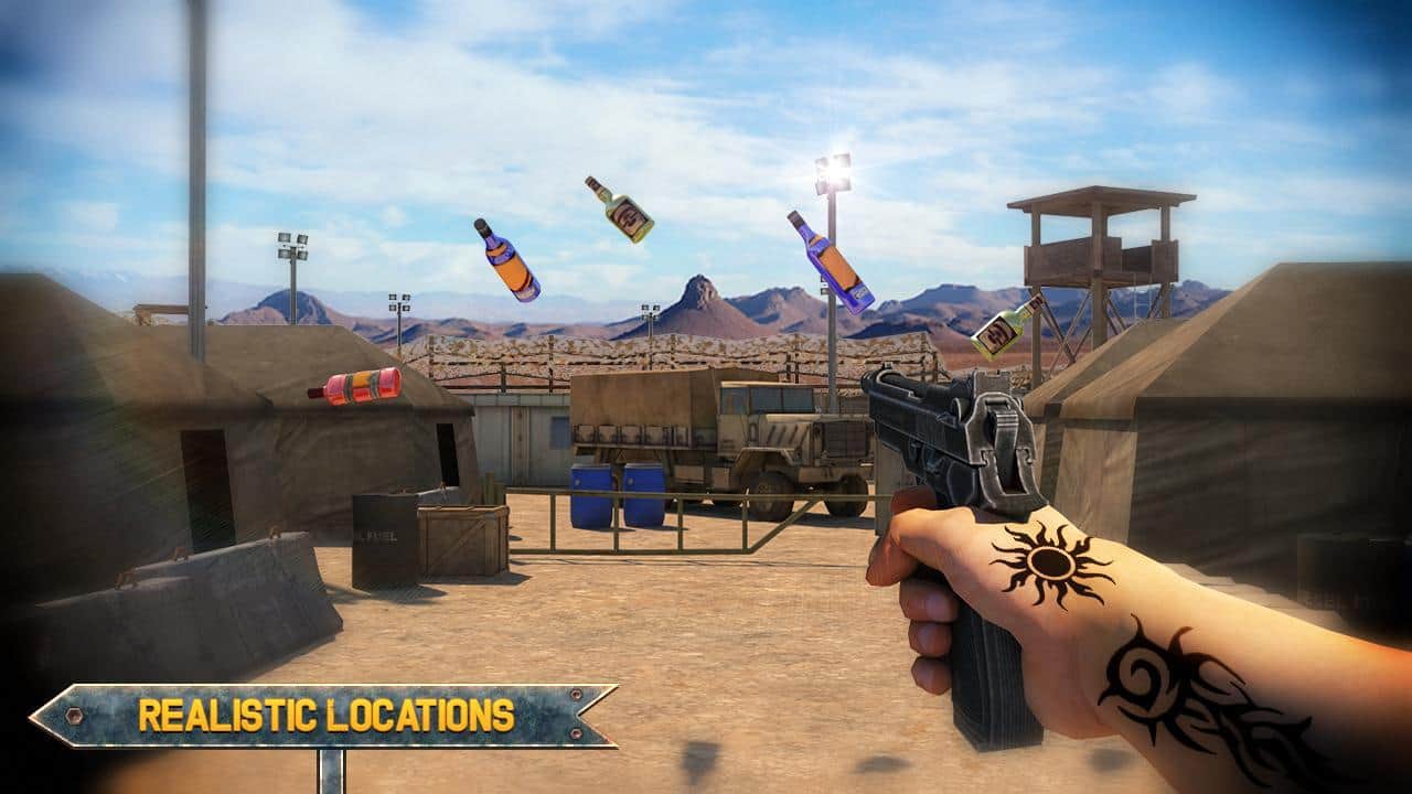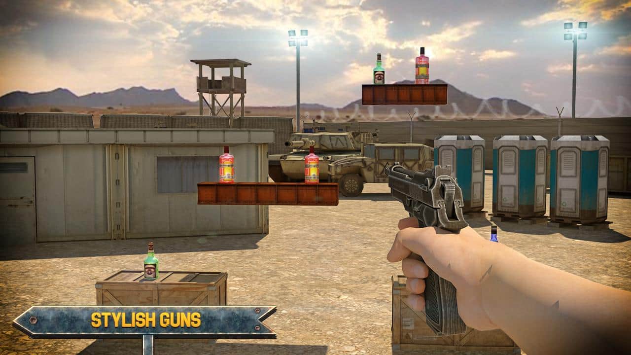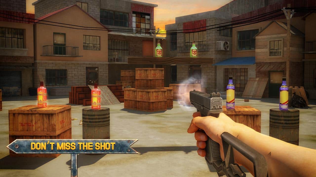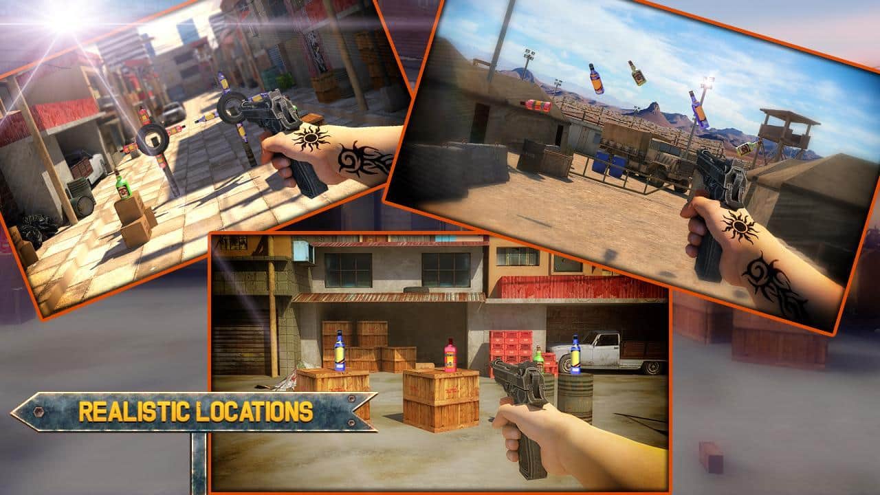 Juego de Tiro de Botellas 3D Experto – juego para Android donde dispararás a las botellas. Apunta y lanza el gancho de tu arma y rompe una botella tras otra. Muestra todas tus habilidades en el tiro al blanco. Con un solo toque de un dedo en la pantalla sobre el objetivo, realiza el disparo. Con cada nuevo nivel, la dificultad del juego aumentará y tendrás más dificultades para acertar a los objetivos. El juego añadirá numerosos obstáculos y un objetivo en movimiento. Descubre nuevas misiones y gana suficientes puntos, convirtiéndote en un maestro del tiro con pistola.