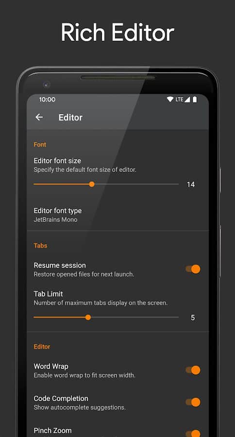 La aplicación Brackeys IDE te ayudará a reconocer y editar algunos lenguajes de programación, ActionScript, C, C ++, C #, HTML, Java, JavaScript, Json, Kotlin, Lisp, Lua, Markdown, Python, Shell, SQL, Visual Basic, XML. Ver instantáneamente el código correcto ayudará a la resaltación de sintaxis y un editor integrado proporcionará conclusiones básicas, dados los contenidos de cada archivo. Usa palabras clave, cambia nombres de campos, corrige cambios, resalta errores en el código mediante resaltado. Hay una función de AutoGuardado de cambios, así como con el botón "cancelar" siempre puedes volver a la vista anterior tras la aceptación de cualquier error.