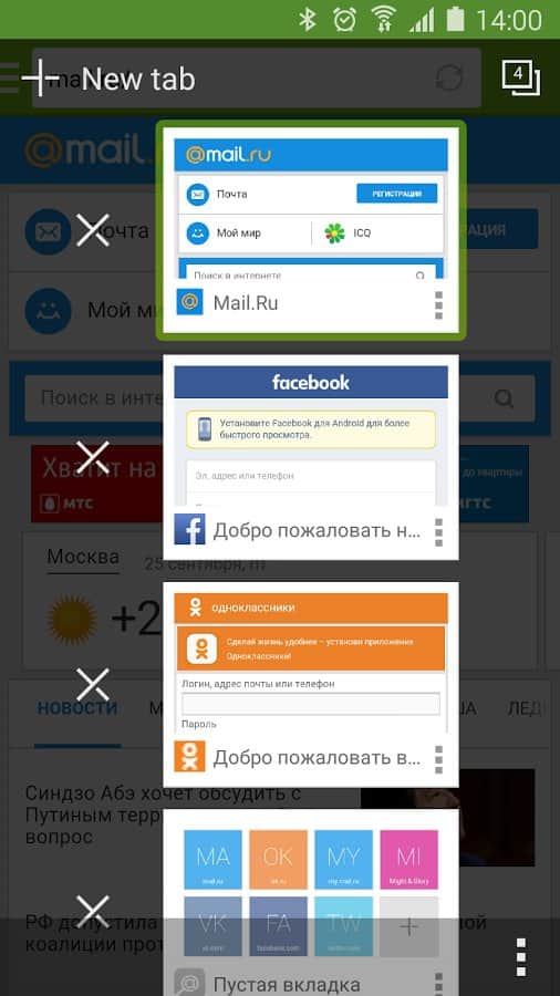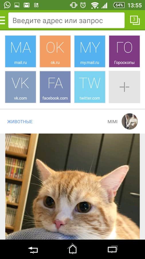 En la pantalla principal del navegador siempre hay enlaces a sitios populares: Odnoklassniki, Twitter, Mail.Ru, Moi Mir, Vkontakte, Facebook, Sport Mail.Ru y Afisha Mail.Ru.