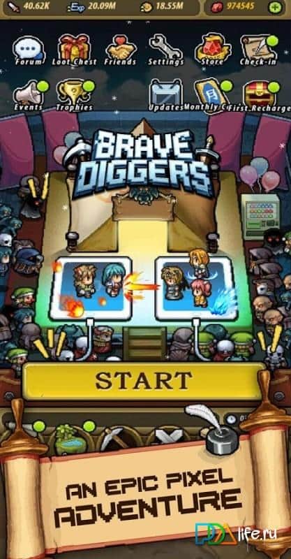 Brave Diggers - un juego que es bastante difícil de atribuir a un género específico, porque aquí hay elementos de juegos de rol, clickers, excavadoras, simulación urbana, y quizás no sea todo. Así que, tienes que empezar con el hecho de que, ubicado en las profundidades de la tierra, debes excavar un poco de oro. Después de obtener un capital inicial, puedes explorar el impresionante mundo del juego, completando misiones, matando monstruos, encontrando secretos y, por supuesto, añadiendo nuevos amigos. A los nuevos amigos, puedes subcontratar el trabajo y así aumentar la extracción de metal valioso, que, nuevamente, puedes invertir en el desarrollo de la empresa. De esta manera, pronto puedes convertirte en un verdadero magnate, pero necesitarás conseguir un par de docenas de amigos.