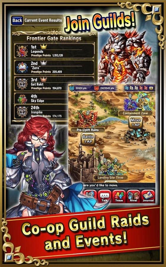 Brave Frontier, un juego de RPG gratuito de desarrolladores asiáticos. El juego contiene una gran cantidad de personajes: según la página oficial del juego, hay alrededor de 200 piezas que no pueden dejar de impresionar. Juega junto a tus amigos, reúne a los clanes y destruye enemigos. También puedes competir cara a cara en PvP. Los gráficos del juego están hechos en forma de anime japonés.