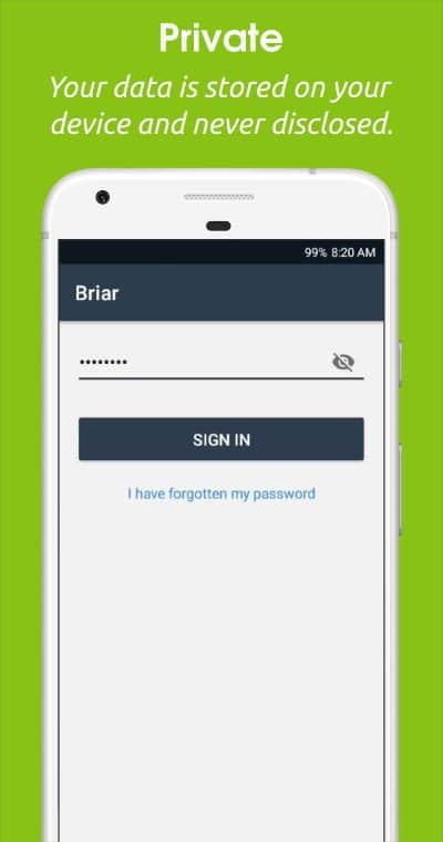 Briar Beta (no lanzado) - un gran mensajero con el que podrás presentarte para chatear de manera anónima con tus amigos. Funciona bajo el mismo principio que el navegador Tor. Así que protegerá tu correspondencia e incluso bloqueará la posibilidad de quitar la pantalla y tomar capturas de pantalla mientras la aplicación está en funcionamiento. Chatea con tus amigos y guarda tus propios datos.