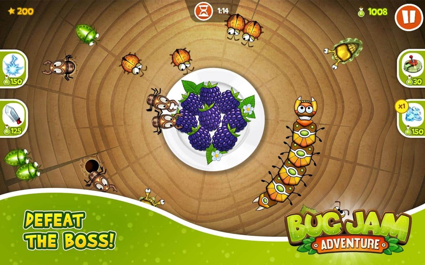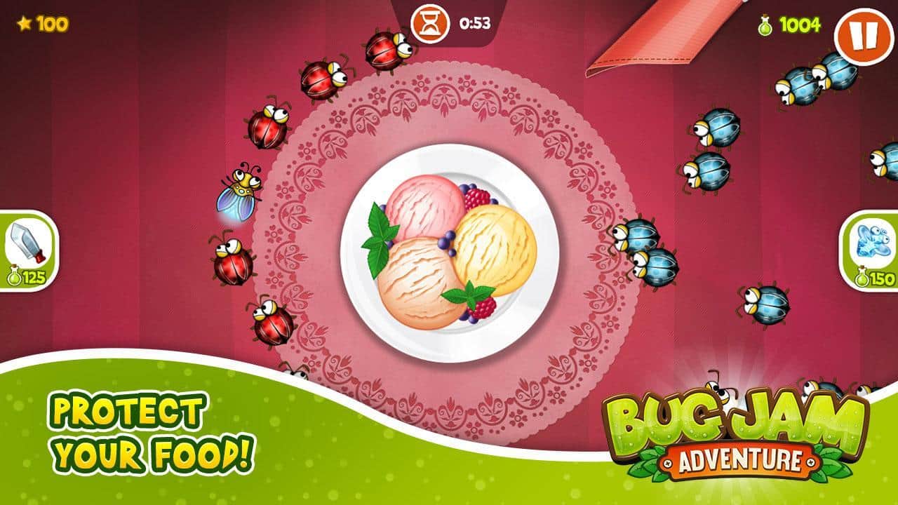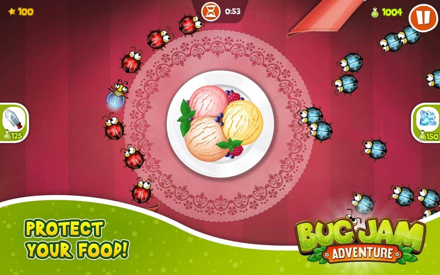 Aventura de Jam de Insectos – tu dulzura está siendo atacada por varios escarabajos y orugas, déjalos luchar en este juego para Android. En el centro de la pantalla hay un plato con pasteles y dulces rodeado de insectos que se arrastran, tu tarea será, utilizando toques en la pantalla, no dejar que coman tus bocadillos. Aplasta insectos y bichos con tu dedo y congélalos, destrúyelos con fuego y hazlos volar con bombas. Establece tu récord en este juego y cuenta con la ayuda de ranas, que destruirán insectos en bolas.