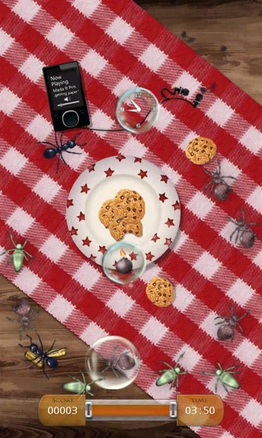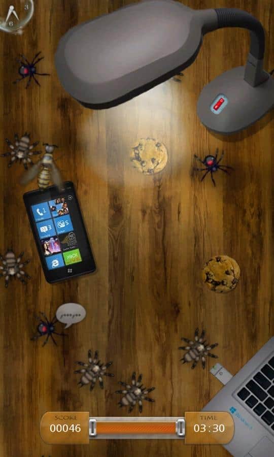 Juego Bug Tap para Windows Phone en el que tu casa será invadida por pequeños insectos parlantes. Con un objetivo: comer todo lo comestible en ella. Puedes matarlos con tu dedo, golpeando o deslizándote por la pantalla para proteger tu comida. Y serás atacado por abejas y escorpiones, picando tus dedos, así que es mejor no tocarlos.