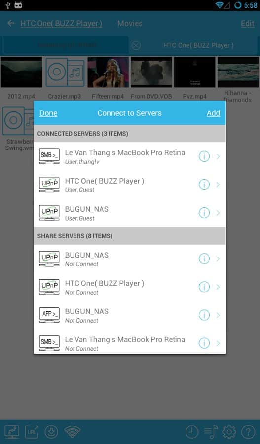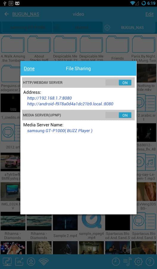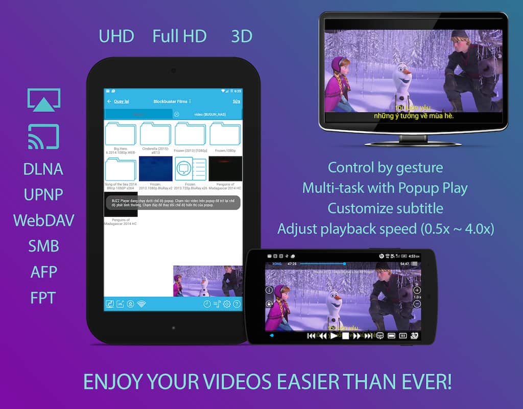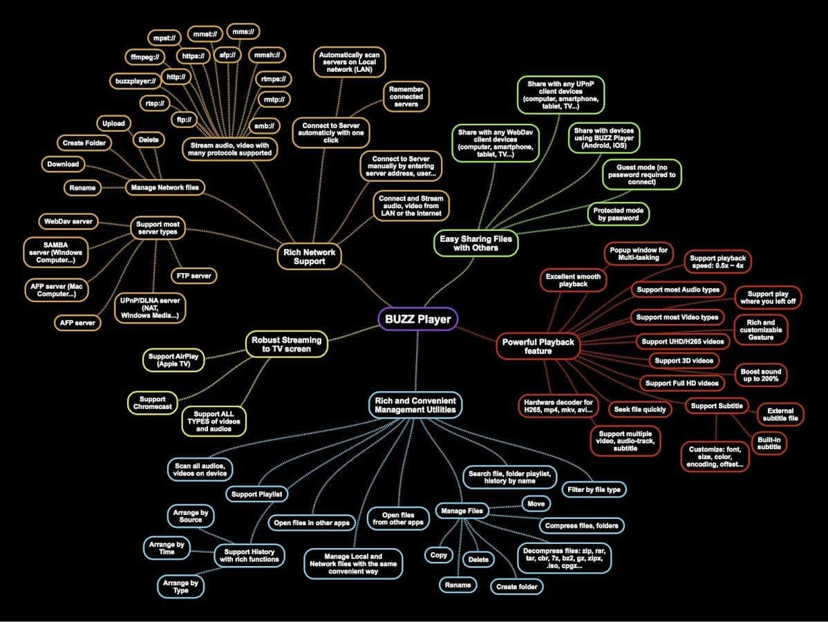 El reproductor multimedia Buzz Player para Android admite una cantidad considerable de códecs. Encontrarás que el programa tiene un conjunto de funciones rico y variado. La aplicación admite subtítulos en muchos idiomas, incluidos inglés, italiano, vietnamita, francés, japonés, alemán, etc., y diferentes tipos — SRT, A * S, SSA, MSI y embebidos. Es posible ajustar la visualización de subtítulos cambiando el color, el tamaño y el tipo de fuente. También puedes cambiar el tiempo de desplazamiento y el lugar. El programa te permite ver películas desde servidores remotos y distribuir archivos de video a través de la red. Esta función es posible gracias al soporte de muchos protocolos, incluidos RTP, RTSP, HTTP, FTP, MMS, Netstream (mpst://), SMB, ffmpeg://. El navegador integrado de la red Buzz Player permite ver y copiar las películas con mi sistema operativo Windows/Mac/Linux.
