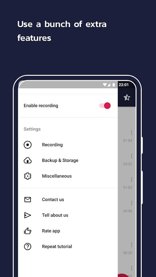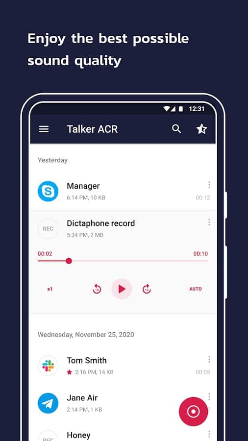 Grabación de llamadas – Talker ACR - Guarda todas las llamadas telefónicas entrantes y salientes por completo, ¡ya que nunca sabes qué información será muy valiosa para ti y será útil para tus propios fines! Al principio, puedes hacer clic fácilmente en el botón "Grabar" de Talker, después de lo cual la grabación comenzará a guardarse automáticamente y solo terminará después de tu intervención o el final de la llamada. Facebook Messenger WeChat, Slack, Hangouts, LINE, KAKAO, IMO Además de las conversaciones telefónicas, la aplicación admite grabación con: Telegram, WhatsApp, Viber, Skype, Facebook Messenger, WeChat, Slack, Hangouts, LINE, KAKAO, IMO.