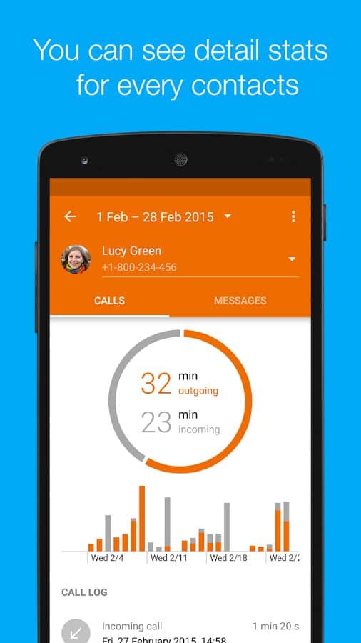Estadísticas de llamadas de Callistics – Si estás cansado de los contactos y mensajes de visualización estándar, reemplázalos por uno más nuevo y funcional. Puedes ver las estadísticas de llamadas y mensajes, todo en gráficos convenientes. También aprenderás cuántas horas has estado hablando con un contacto, cuántas veces lo llamaste y cuántas veces te llamó. Todas las estadísticas de tus llamadas, en una aplicación simple.
