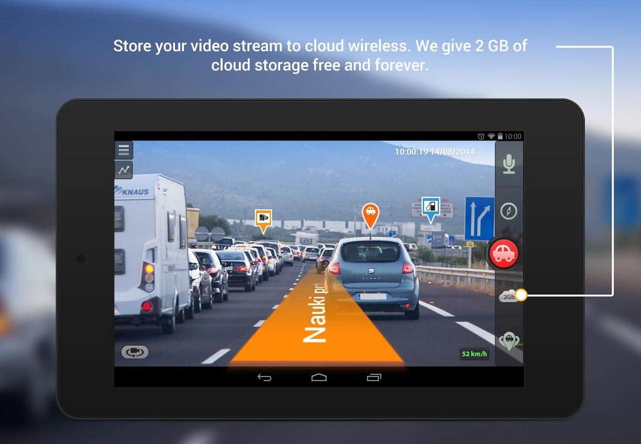 CamOnRoad / Cámara de video y navegador - les presentamos una excelente cámara de video del desarrollador Castarama Ltd, cuya principal característica es la posibilidad de transmitir video a la "nube" y un GPS basado en realidad aumentada con advertencias sobre radares automáticos y cámaras de control de velocidad. Los usuarios registrados de la aplicación reciben 2 GB de espacio en disco, lo que equivale a 3 horas de grabación de video en formato 640x480. Y una gran cantidad de funciones útiles hace que esta aplicación no solo sea extremadamente conveniente al conducir, sino también un asistente indispensable en este proceso.