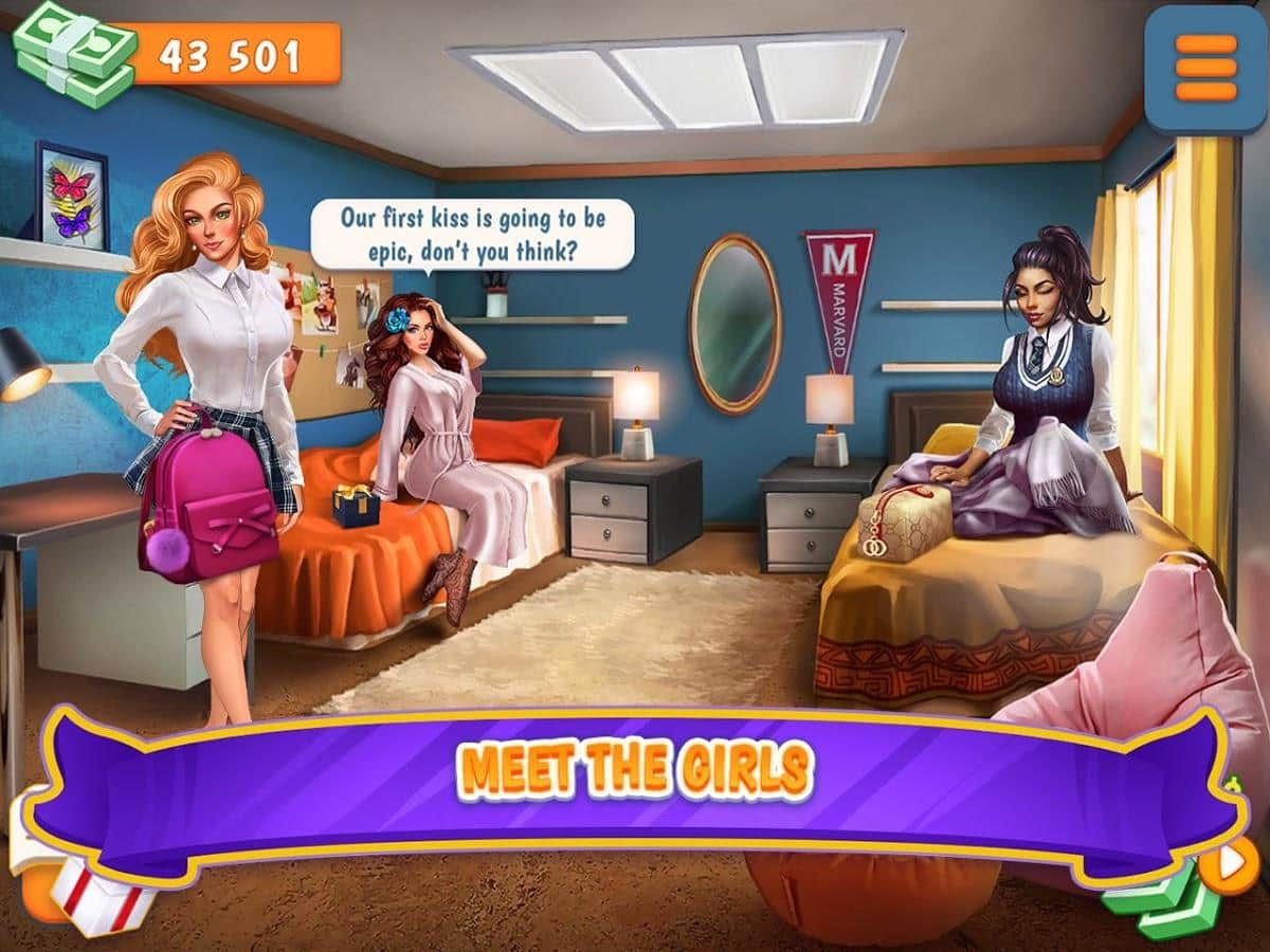 Campus: SIM Date es un divertido simulador de citas en tu teléfono. El radar del teléfono del héroe principal señala el camino hacia el campus universitario de mujeres. Allí, se encuentra con las chicas emocionadas, cada una de las cuales fascina con su belleza. Tienes que conocer a las chicas y tratar de cautivar la atención de cada una de ellas con regalos, cumplidos, coqueteos. Tienes el derecho de decidir el destino del personaje, ya que el juego es interactivo. Todo está en tus manos, elige qué tipo de frase es el momento adecuado para decir o qué hacer. Cada chica es individual y tiene sus propias características. Necesitas encontrar la manera de llegar al corazón de cada una. El campus te dará la oportunidad de relajarte y disfrutar de la comunicación con hermosas chicas.