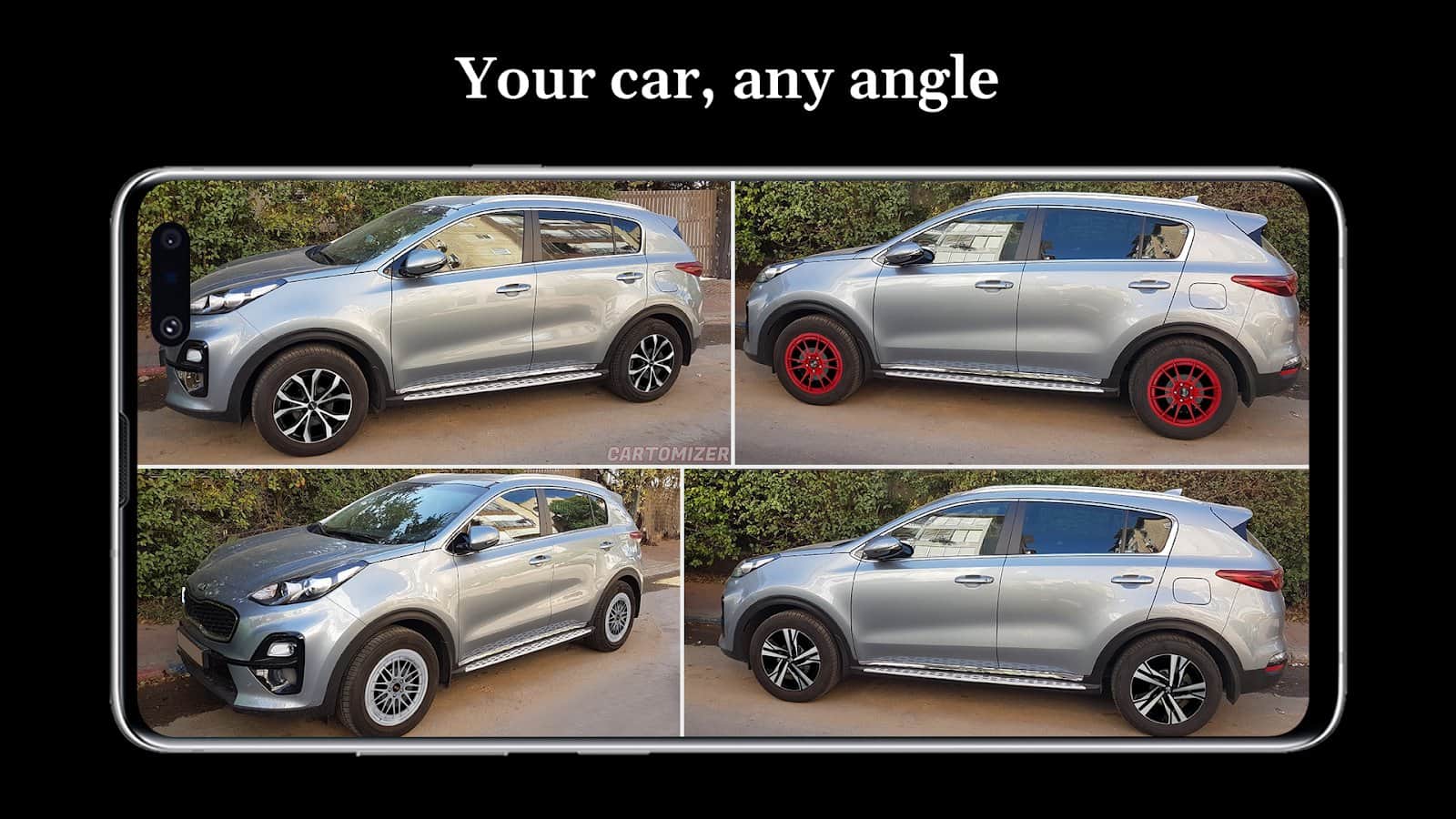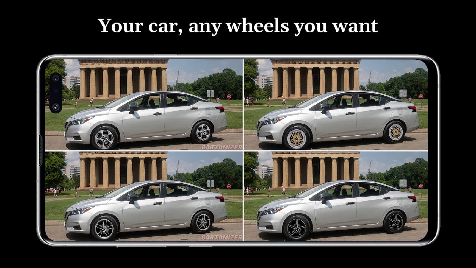 Cartomizer - visualización de las ruedas en tu coche - al comprar un coche, estudiamos cuidadosamente todas las especificaciones y fotos, pero sería genial si lo mismo se pudiera hacer al comprar ruedas. Ya no necesitas desperdiciar tus nervios y energía para elegir el tipo de ruedas para tu coche e intentar imaginar cómo se verán. Con esta aplicación podrás ver cómo se verá tu coche en la vida real. Simplemente sube su foto en la aplicación y prueba diferentes tipos de ruedas, considera cómo se ven y selecciona.