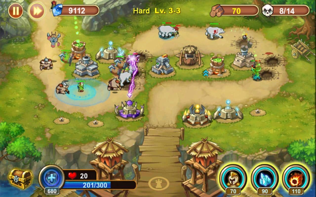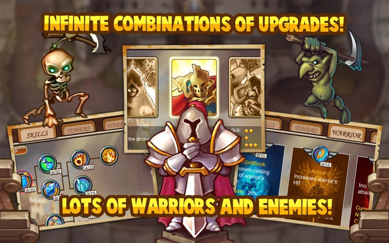 Castle Defense es una gran estrategia en el estilo de Tower Defense, defenderás contra enemigos de 20 especies - osos polares, goblins, fantasmas y jefes. Elige uno de tres personajes - un bárbaro, un paladín o un mago, luego desarrolla una estrategia, coloca y guía tus 4 tipos principales y 8 torres principales y comienza un ataque defensivo y destructivo contra el enemigo que se aproxima. A lo largo de las 15 ubicaciones defenderás tu derecho a la vida, aumentando así tu credibilidad y ganando muchos logros (hasta 30). Bueno, después de jugar toda la partida en modo normal, desbloquearás el nivel de dificultad difícil y varias mejoras.
