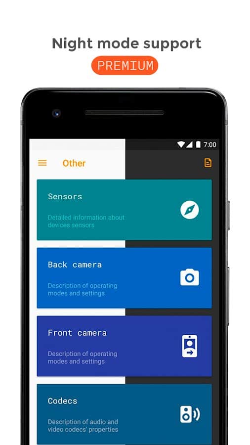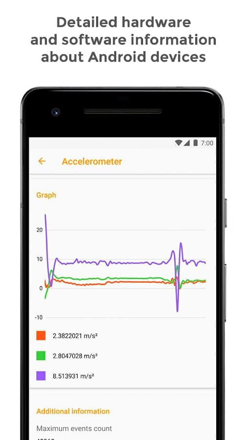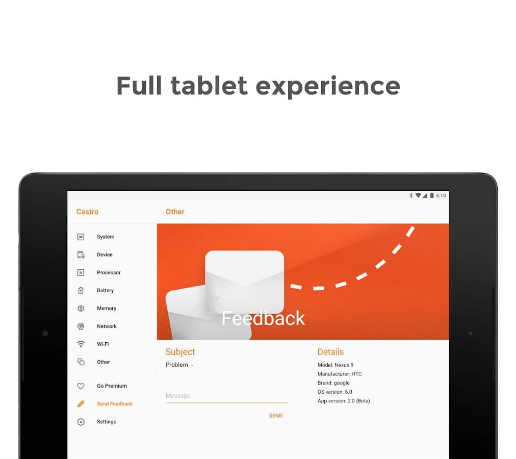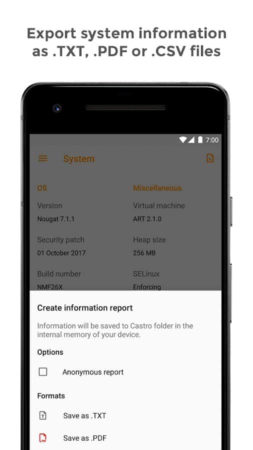 Castro muestra en tiempo real la carga del procesador y sus características principales, el estado de la memoria RAM y de la memoria permanente, datos sobre redes móviles, Wi-Fi, el estado de la batería y su posible calentamiento, y mucho más.