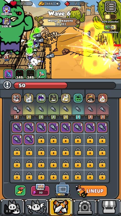 Arqueros Gato - Defensa Ociosa - ¡El reino está en peligro! Solo los guerreros gato pueden salvarlo de interminables oleadas de monstruos. En el juego, debes unir a los guerreros gato y equiparlos con poderosas armas para derrotar a los enemigos. Varias islas te esperan en tu camino, cada una de las cuales está habitada por monstruos y jefes únicos. Prepárate para una jugabilidad rica que te llevará a una emocionante aventura. Puedes invocar y coleccionar poderosos héroes Gato que te ayudarán en la batalla.